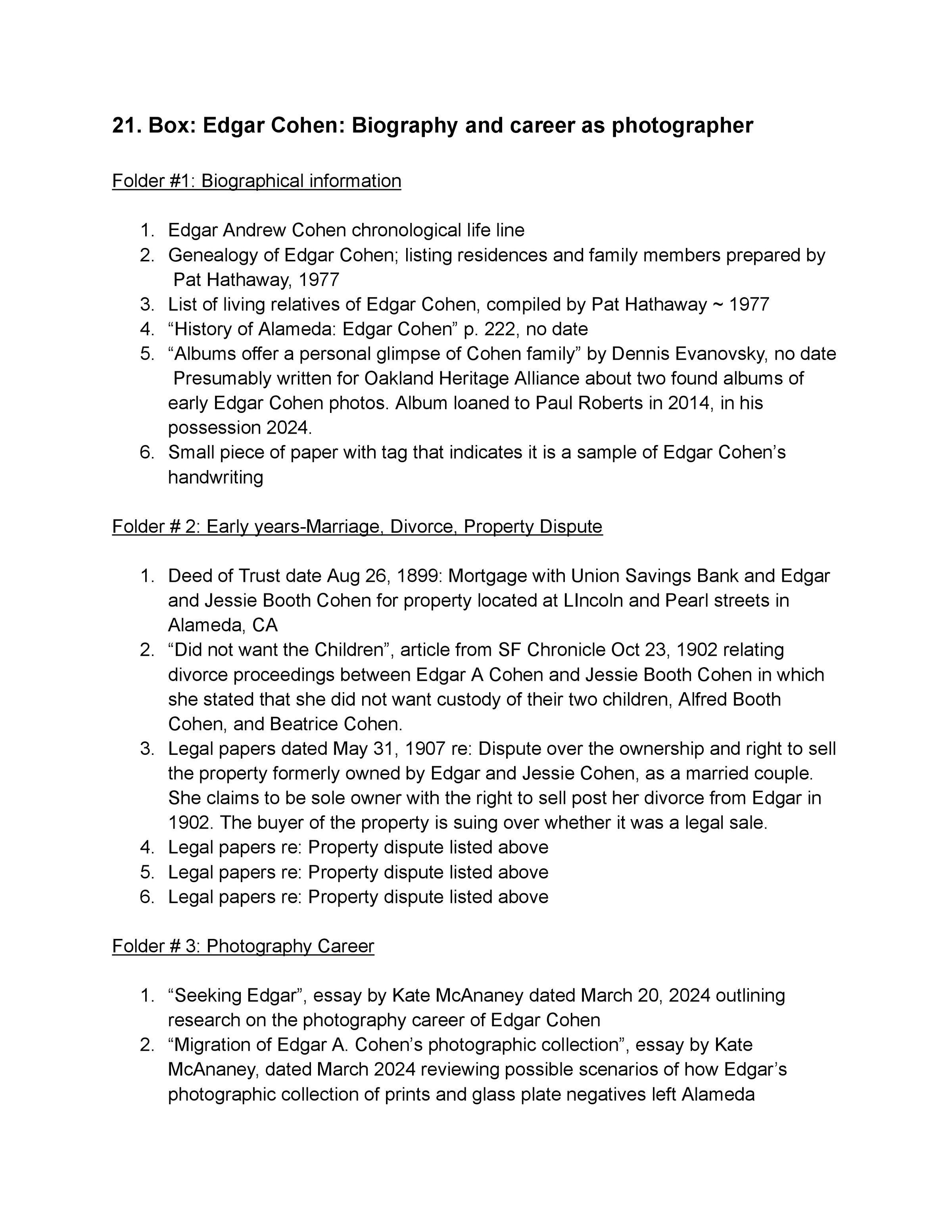 Box 21: Biographical information on Edgar Cohen and his career as an early CA photographer.