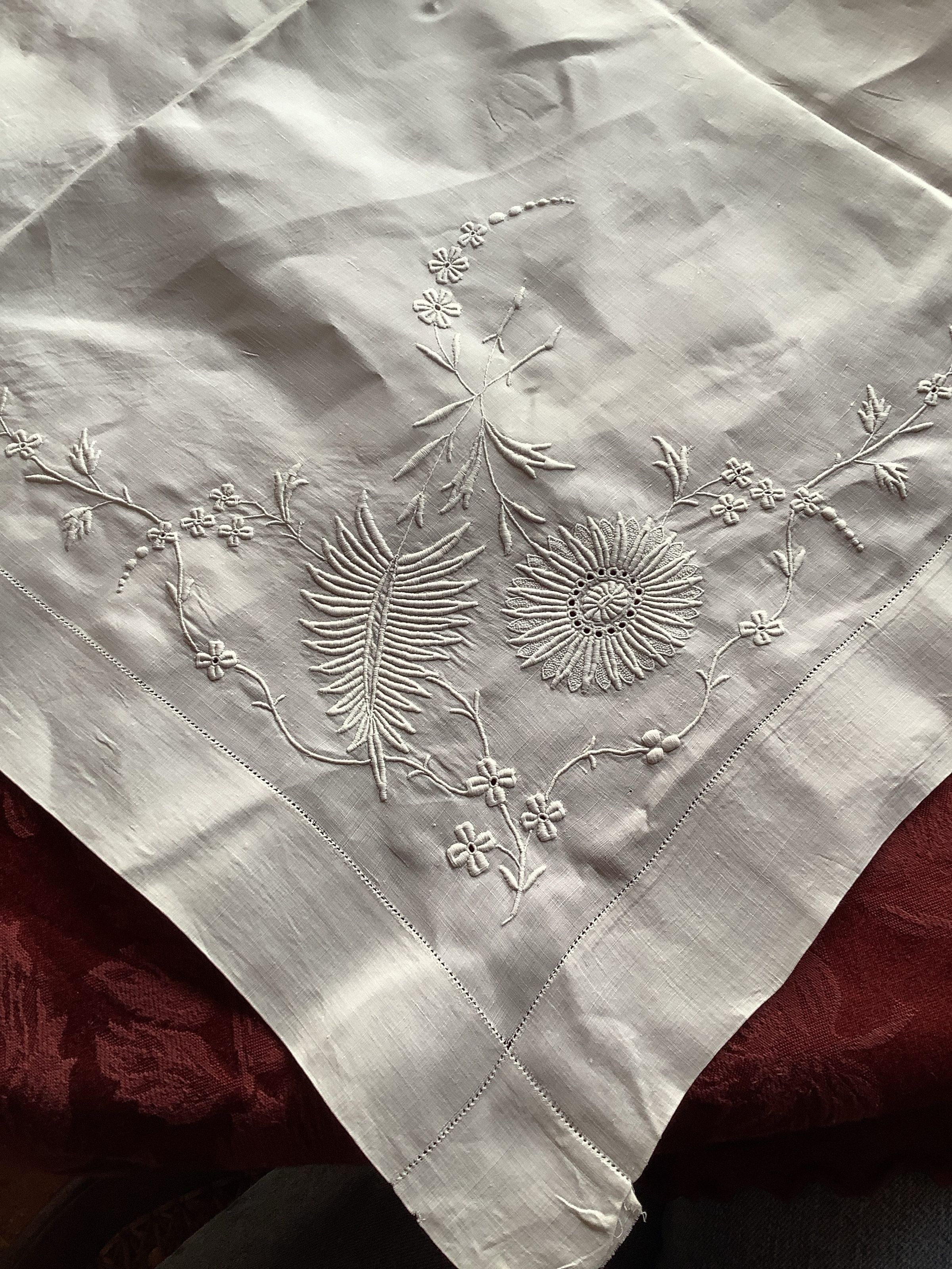 This is a large rectangular textile with flowers and germs embroidered in the corners. There is a small printed “C” design in the very middle, the “C” takes place right where the sewn seam is and has been distorted. There is some significant creasing. There is a sewn seam down the middle that stops before reaching the edges.Create Date