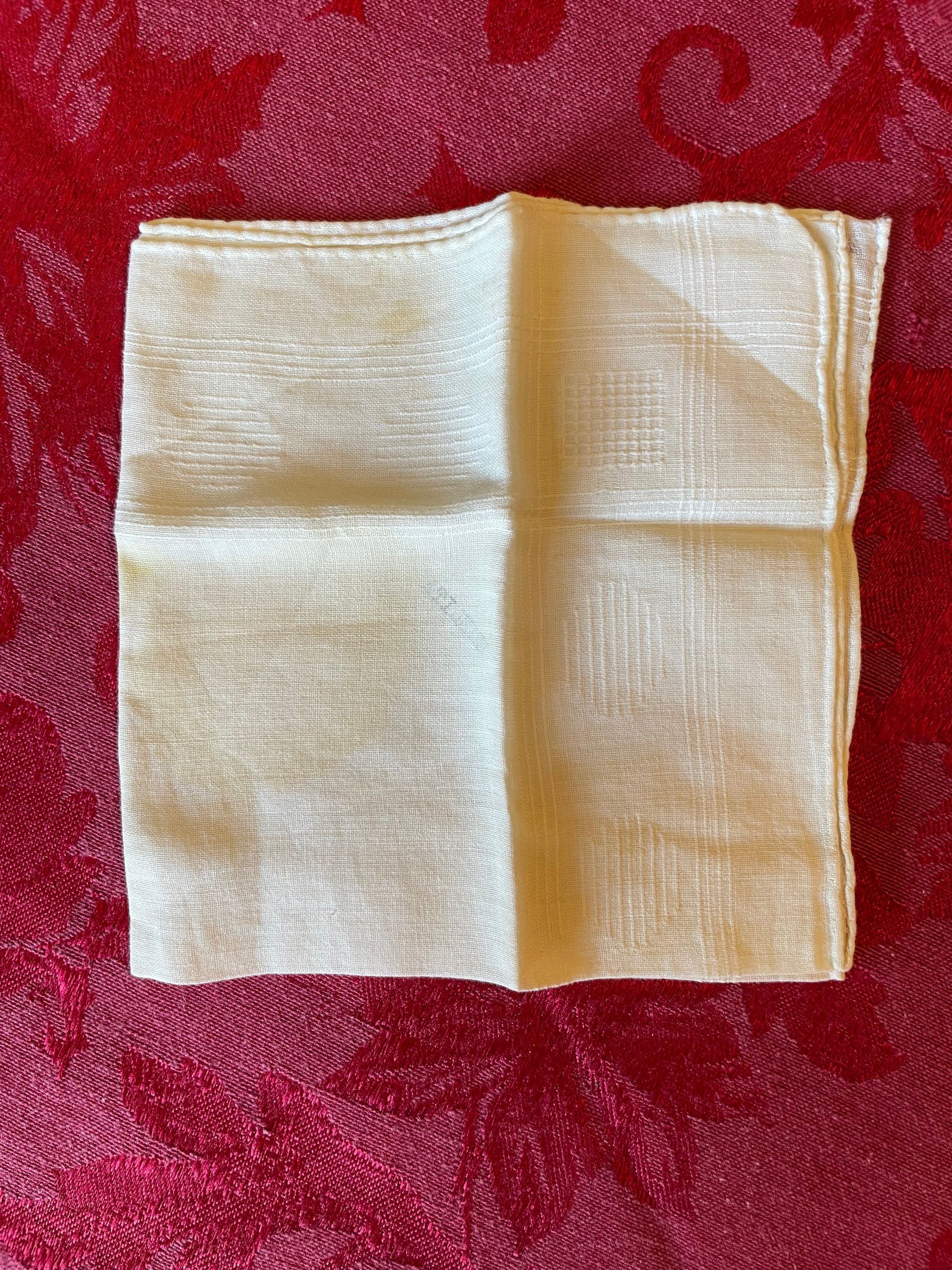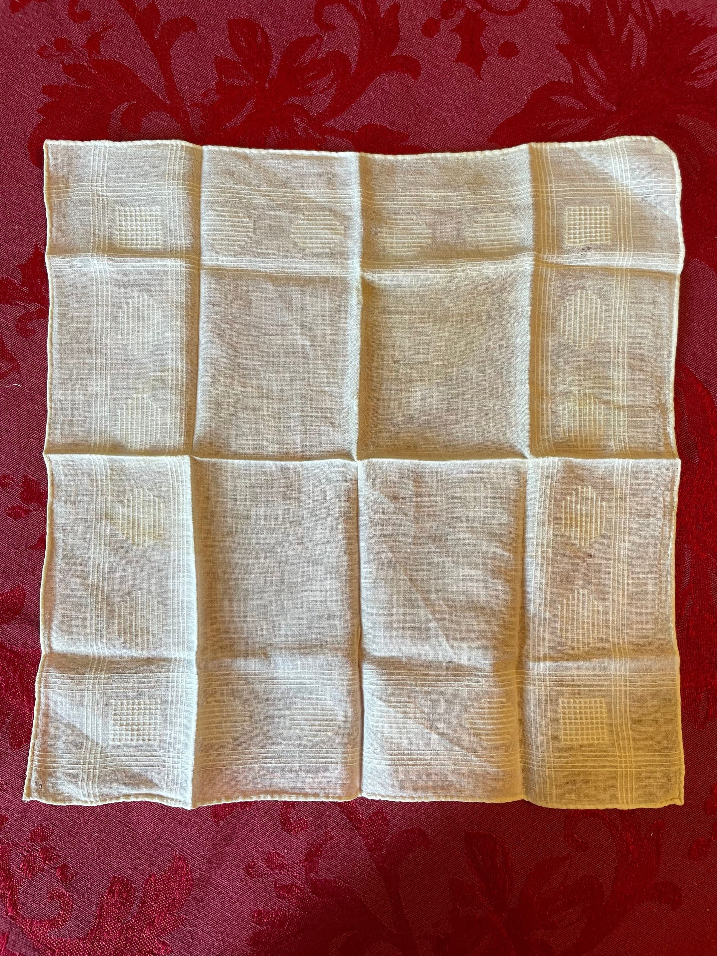 A white patterned handkerchief with close stitching and a geometric pattern lining the fabric. The shapes running along the border are squares and octagons.
