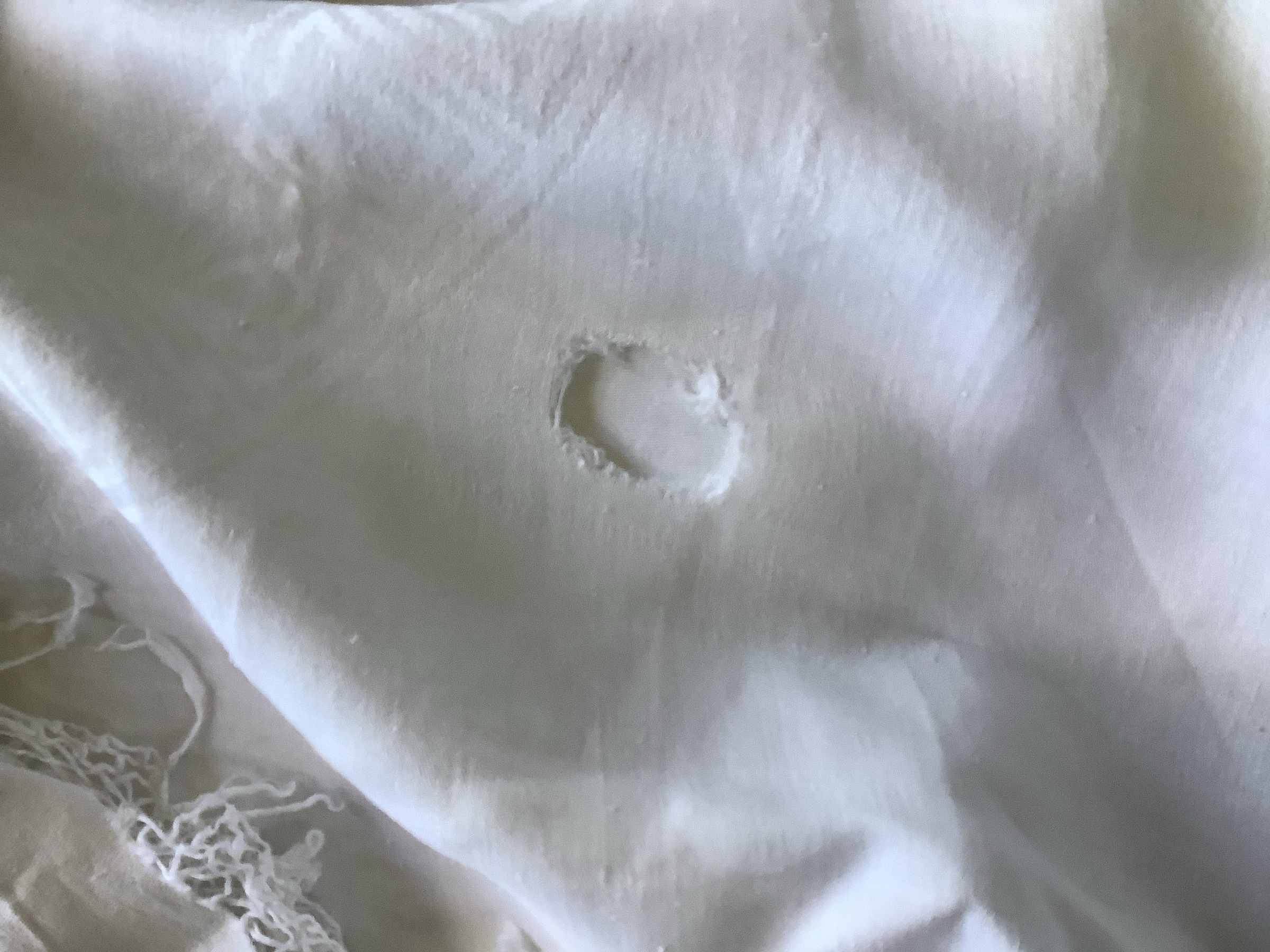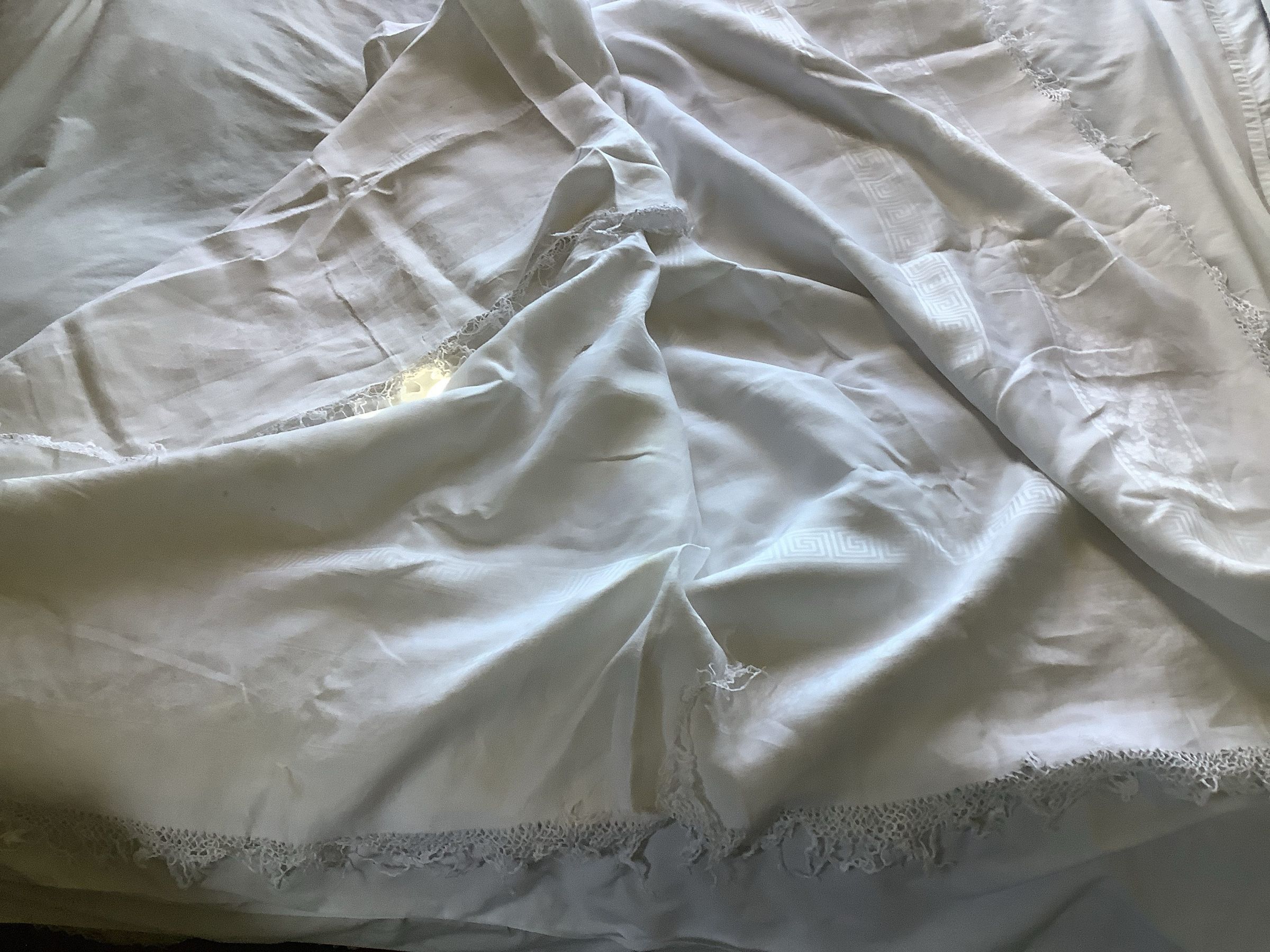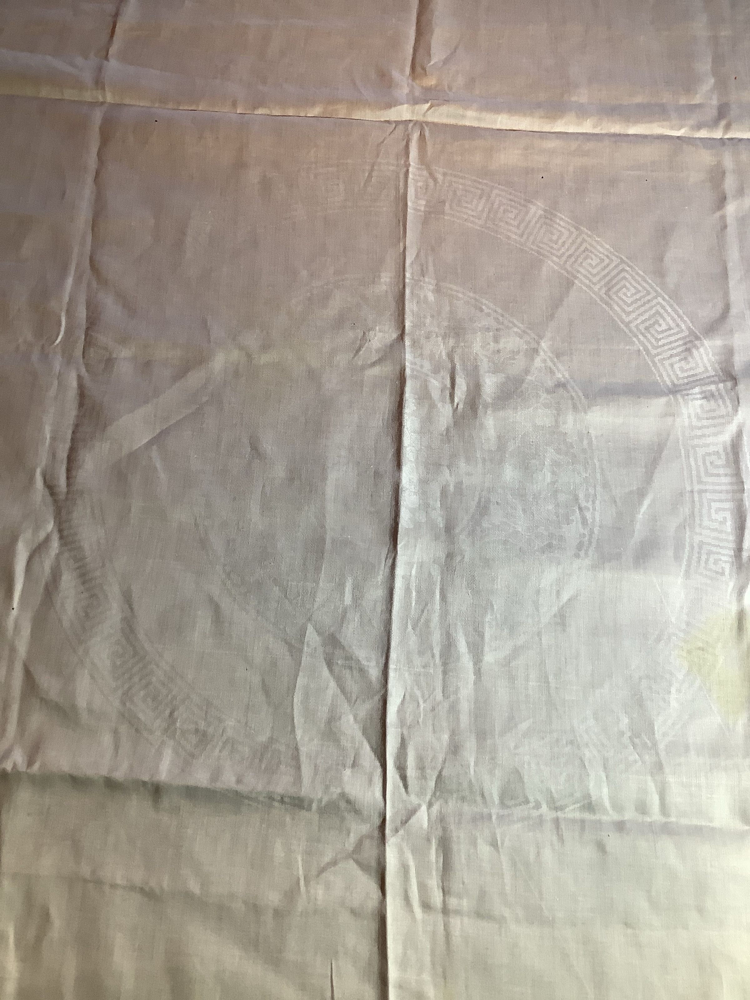 This is a large rectangle table cloth it fits 4 leaves. There are many small holes and yellow stains. In the damask designs there are two medallions. Around the edge there is a fringe thread style. There is significant creases in the the fabric from folding.Create Date