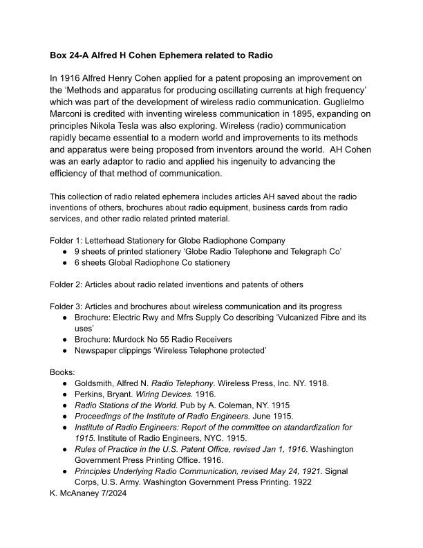 Box 24-A: Items saved by Alfred Henry Cohen that relate to the invention of wireless communication including books, brochures, and articles. Also includes letterhead for Globe RadioCreate Date