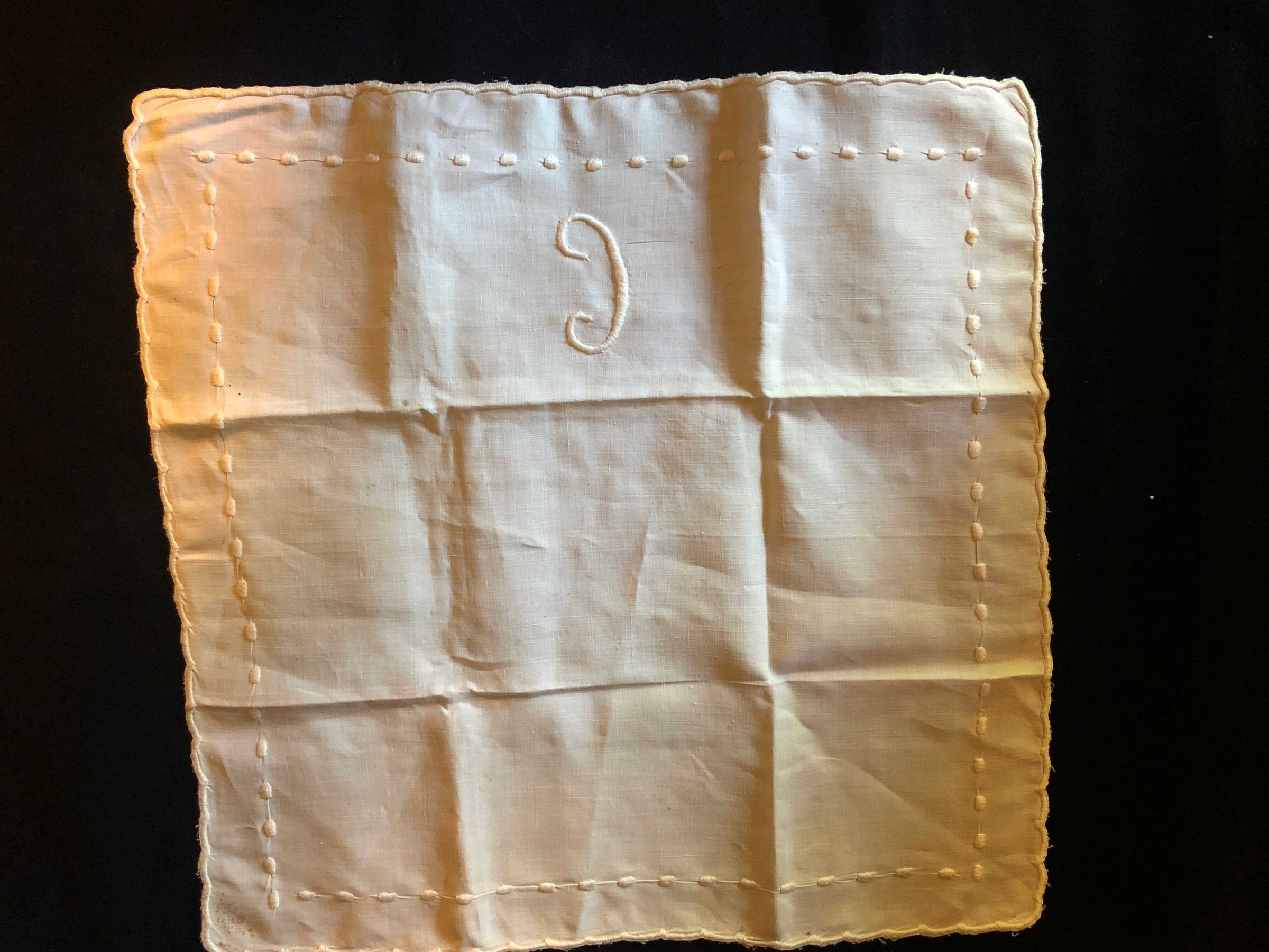 Embroidered dot table linen with letter “c” on one side and scalloped edges