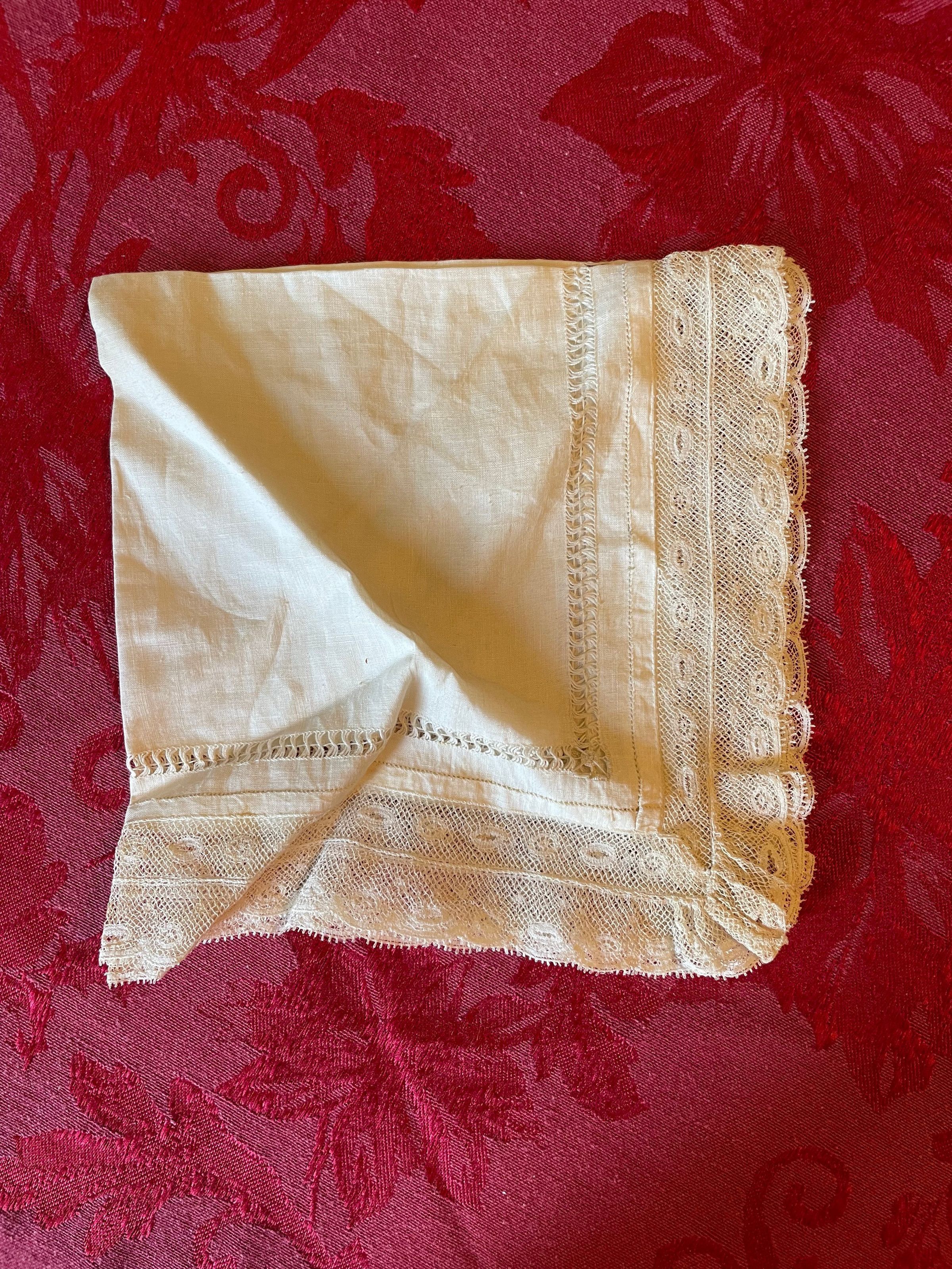 A white lace handkerchief with a type of open stitching running along the inside of the fabric. The lace border has little eyelets strewn throughout and continues that pattern all the way around. There is no visible staining.Create Date
