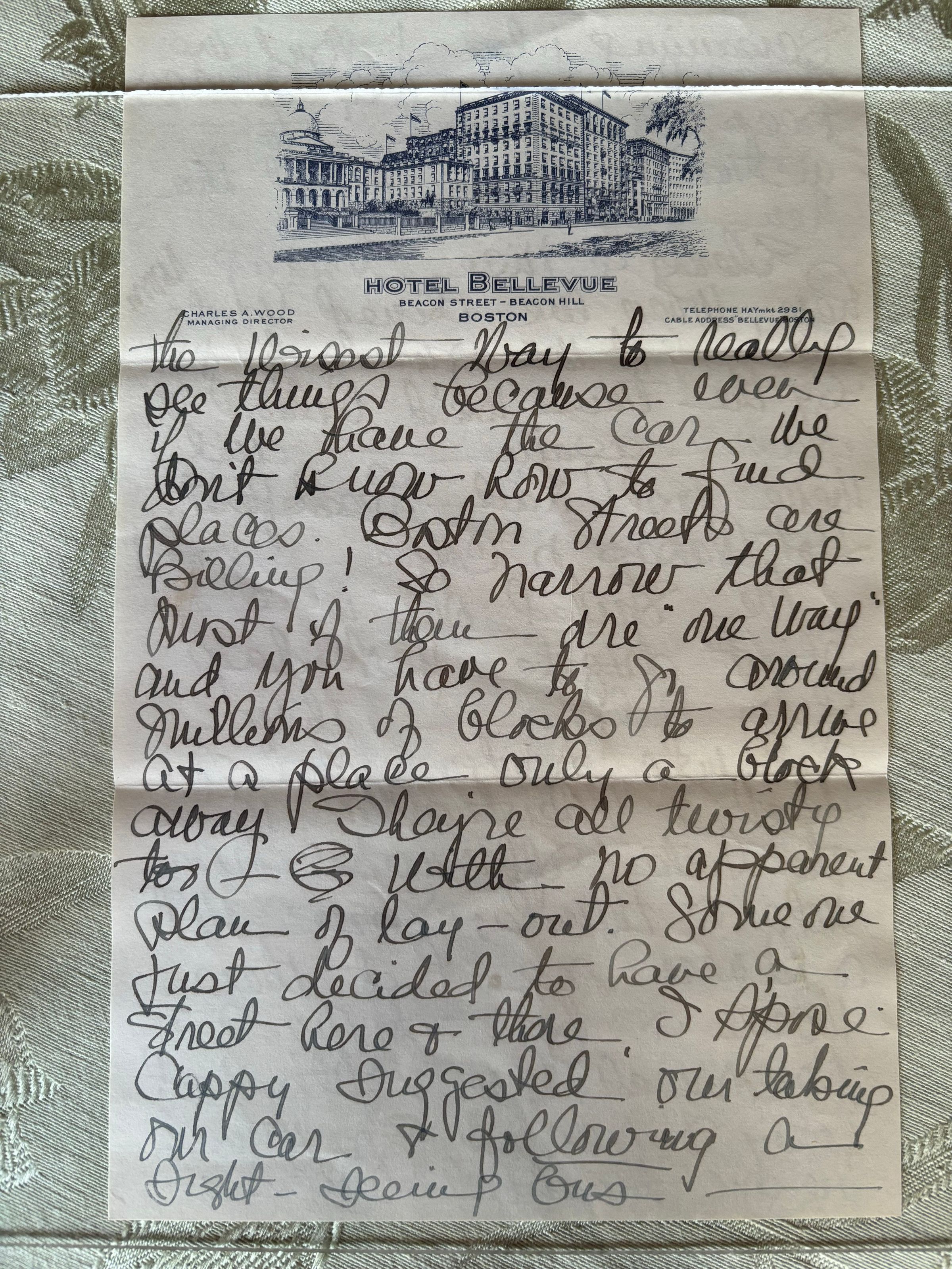 This letter is from when Emelita stayed at the Hotel Bellevue in Boston on Beacon St. She mentions how small the streets are in Boston and all the one way roads that bothered her. She is also was planning on visiting Harvard while she was in Boston.Create Date