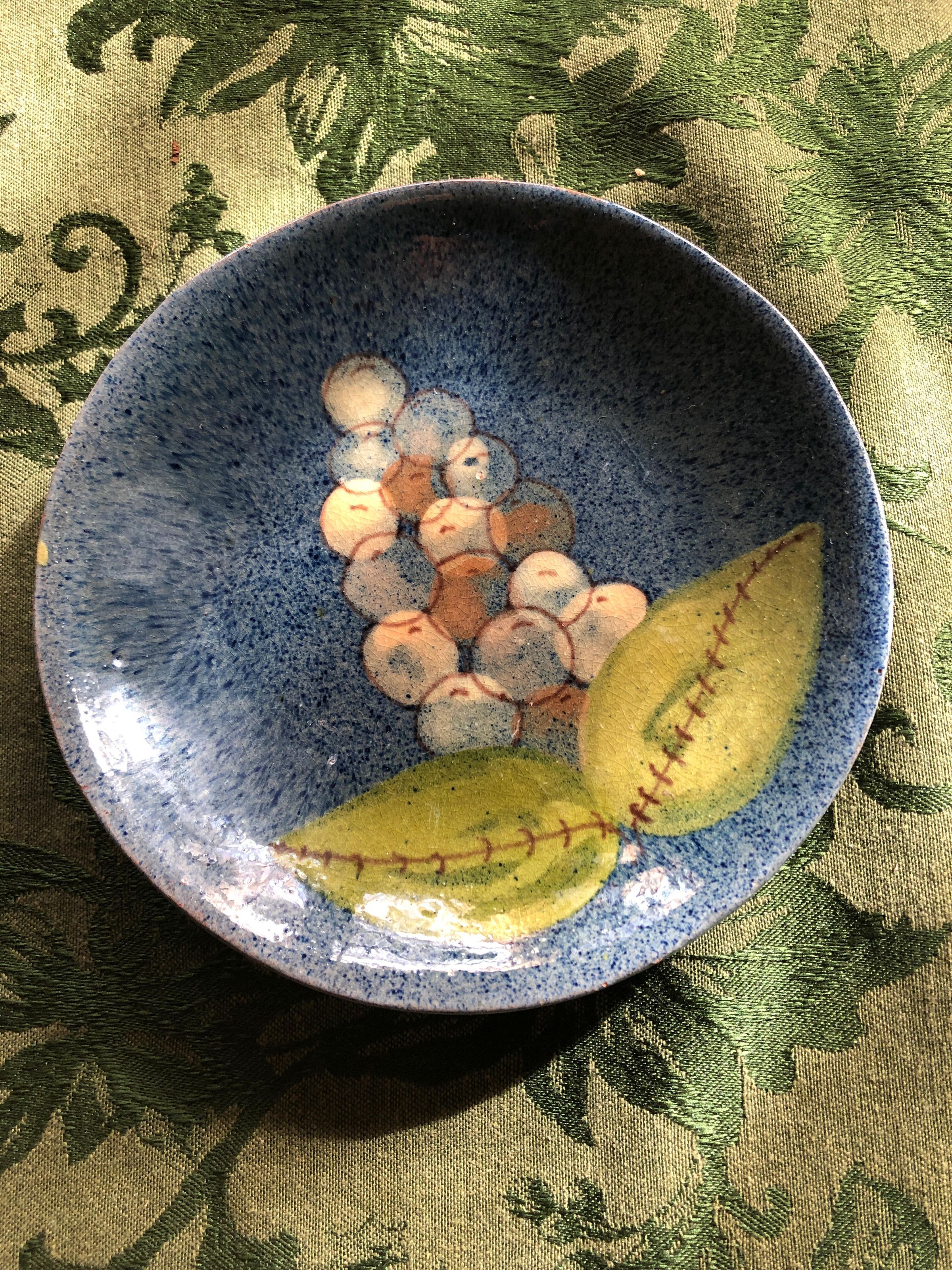 Small shallow blue speckled plate with hand painted leaves and grape clusterInscription/Signature/Marks