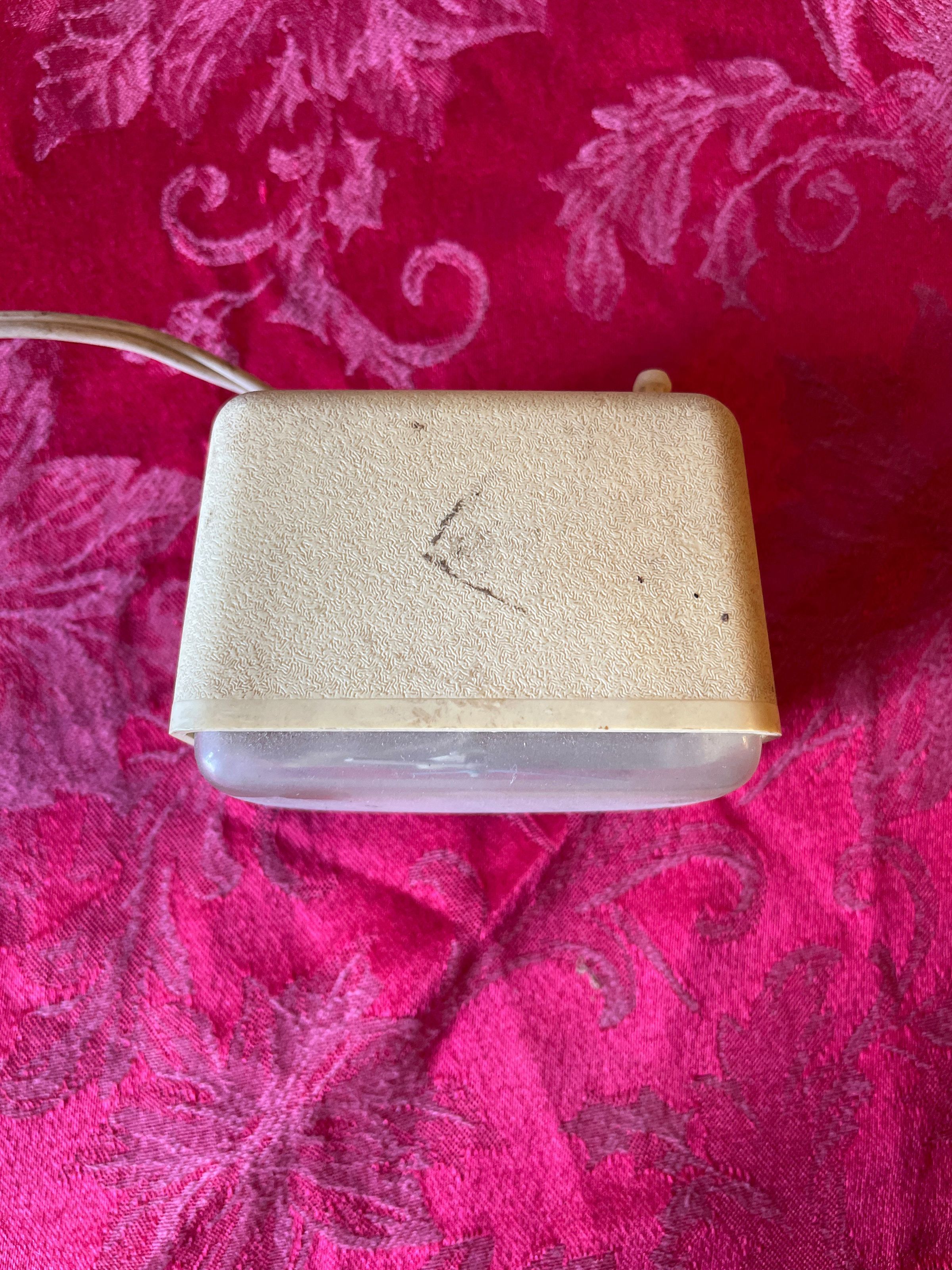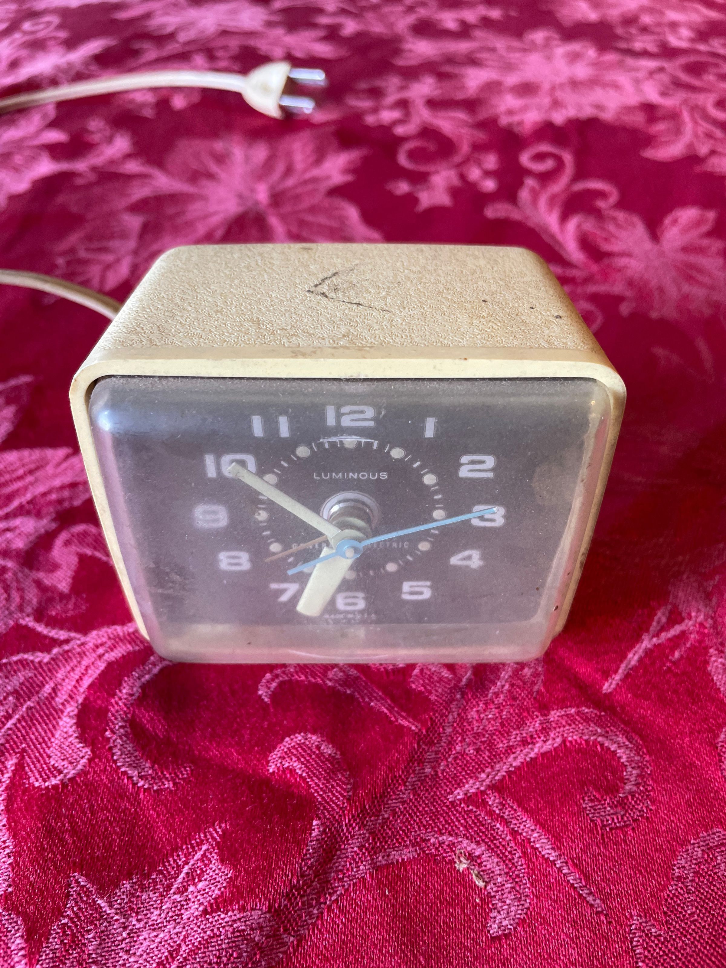 General Electric plug-in clock with a black face. It reads, “luminous” at the top and has four hands.