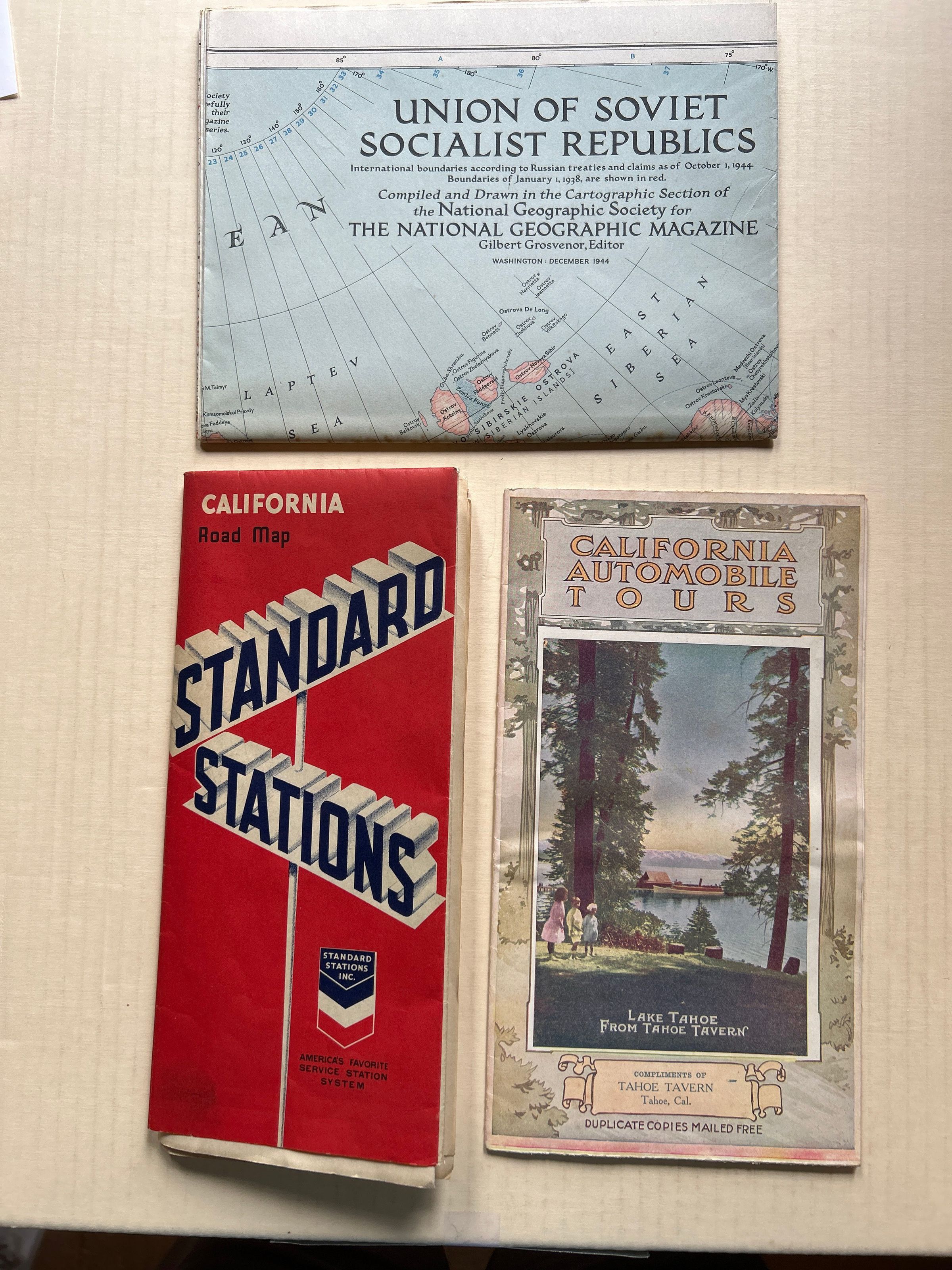 Map of USSR printed by National Geographic 1944; Map of California showing Standard Oil gas stations printed 1935; Map of California Automobile Tours of Lake Tahoe region printed 1914