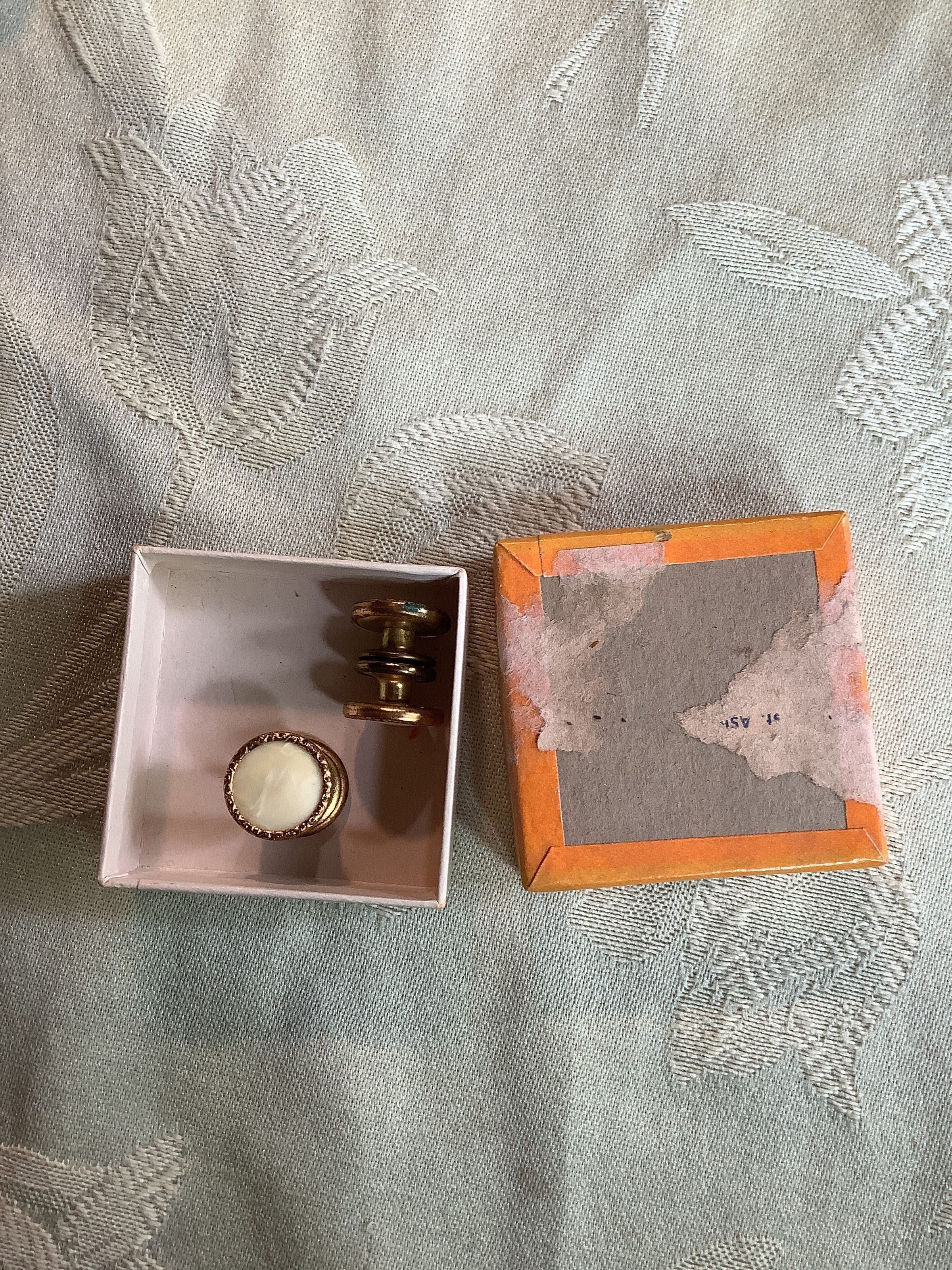 Set of gold with mother of pearl plated snap cuff links, probably from 1910-1930s. These are Lion Brand, made in England.Collection