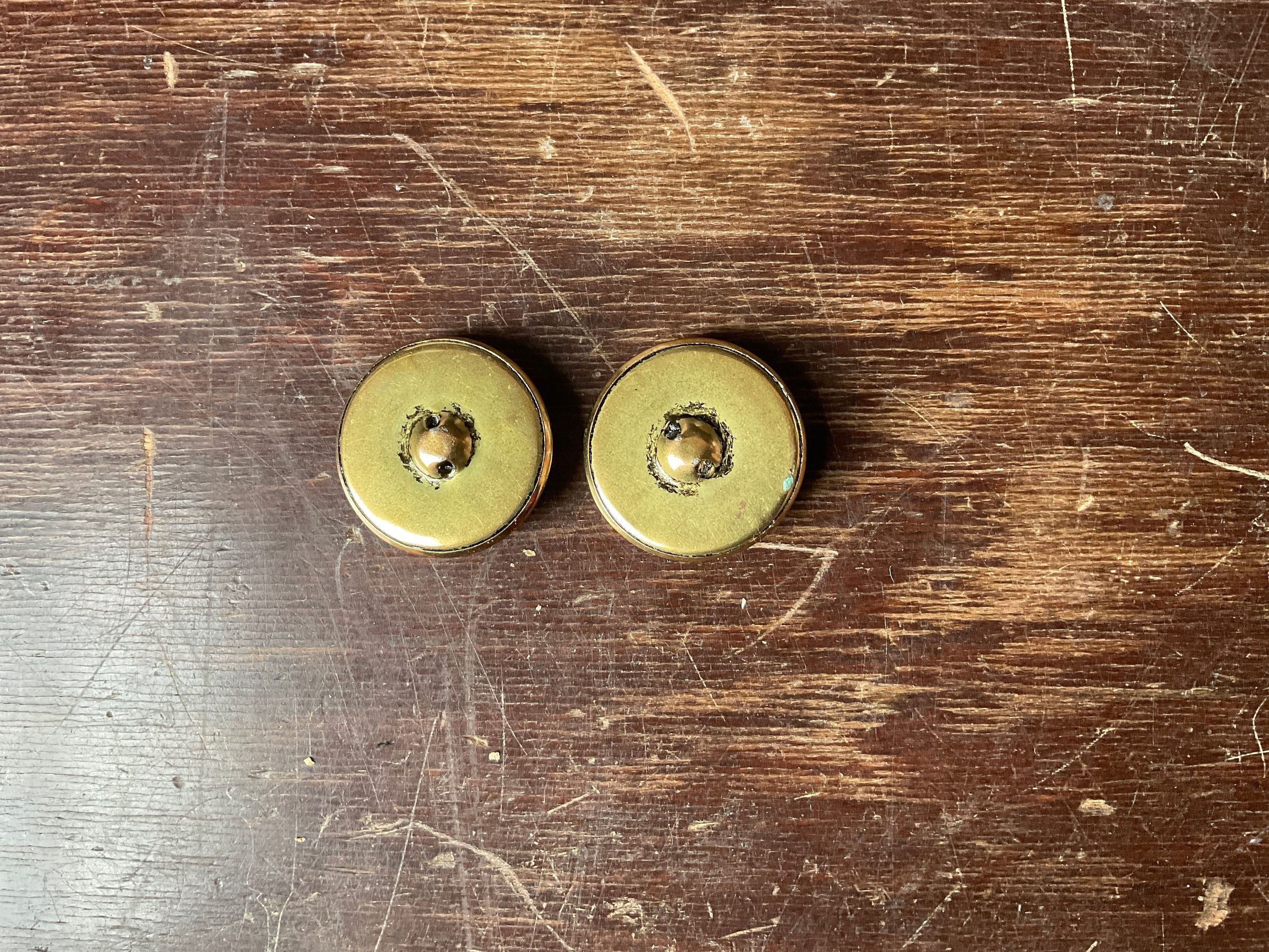 Pair of gold color buttons. They have a spiral pattern on the front.