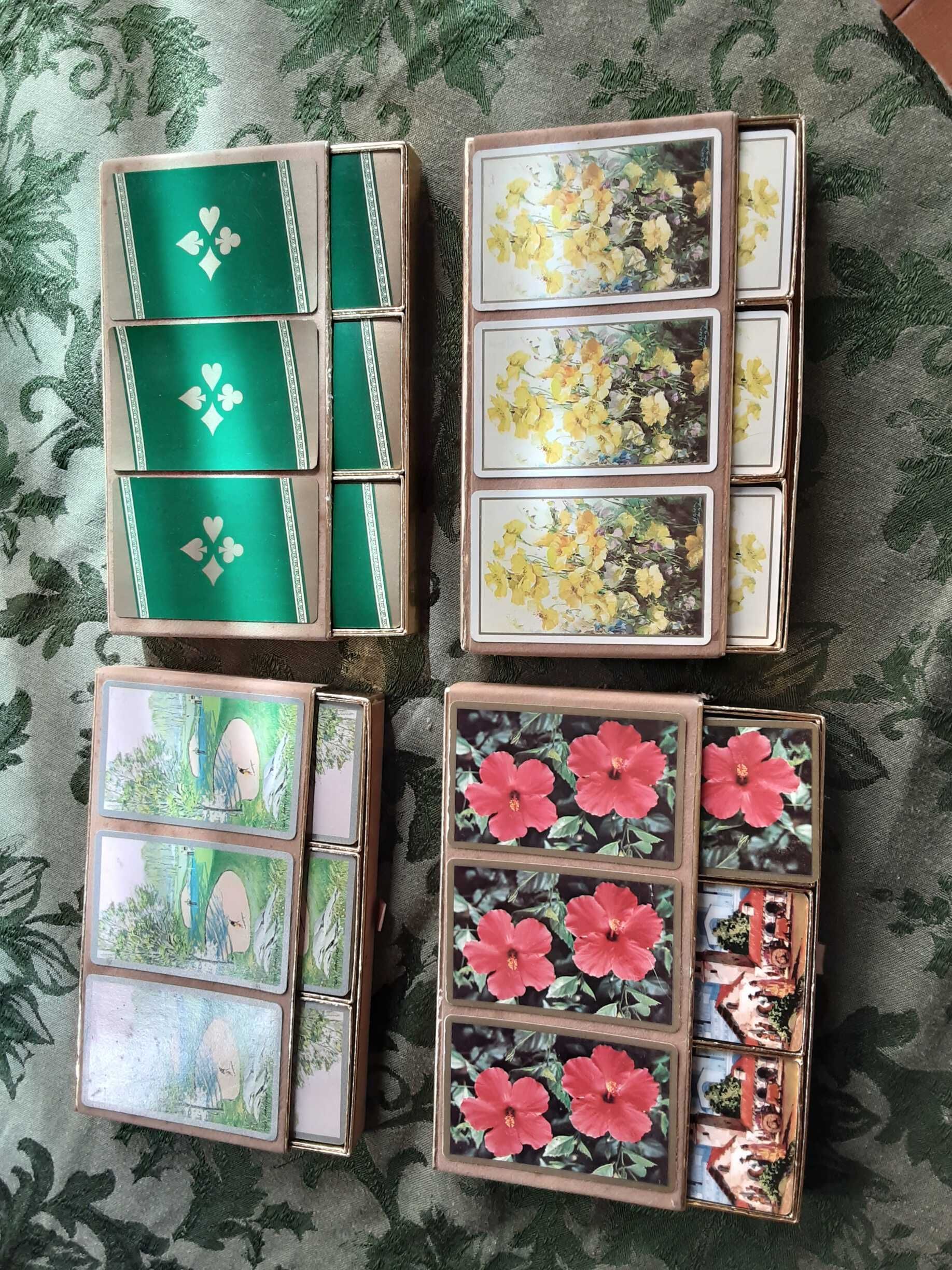 Four sets of three decks of cards for Canasta. One in green with the four suits done in white, one with a scene of light yellow flowers, one with a scene of people on a golf course, one imprinted with green leaves and two hibiscus blossomsCreate Date