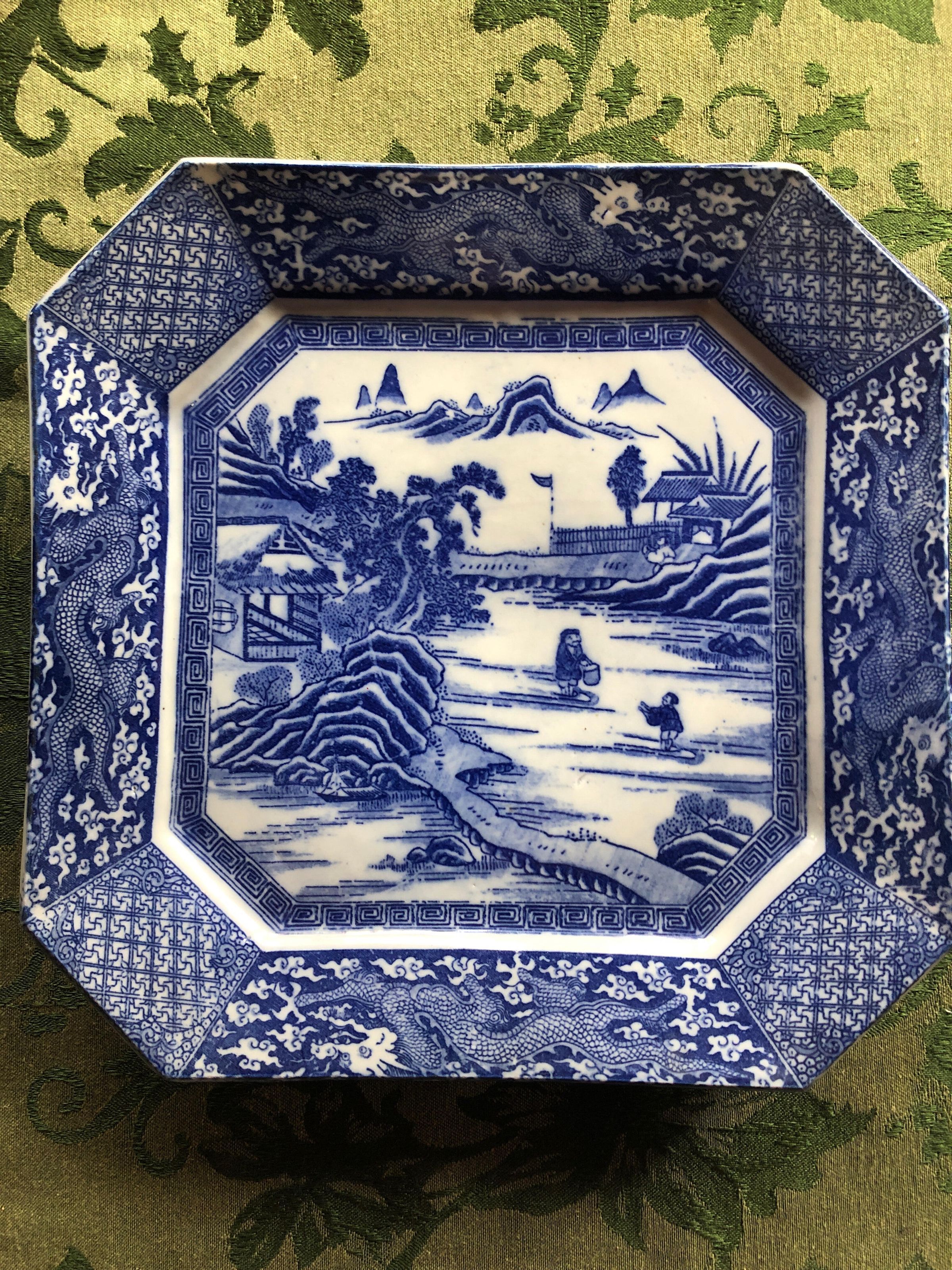 Octagonal shaped blue and white Asian-themed scenery painted in the center with hills, people and structures, framed with geometrical design, outer edges decorated with alternating sections of lattice pattern and scaled dragons. Bottom has four ribbon designs and blue outlined circles. No insignia.Create Date