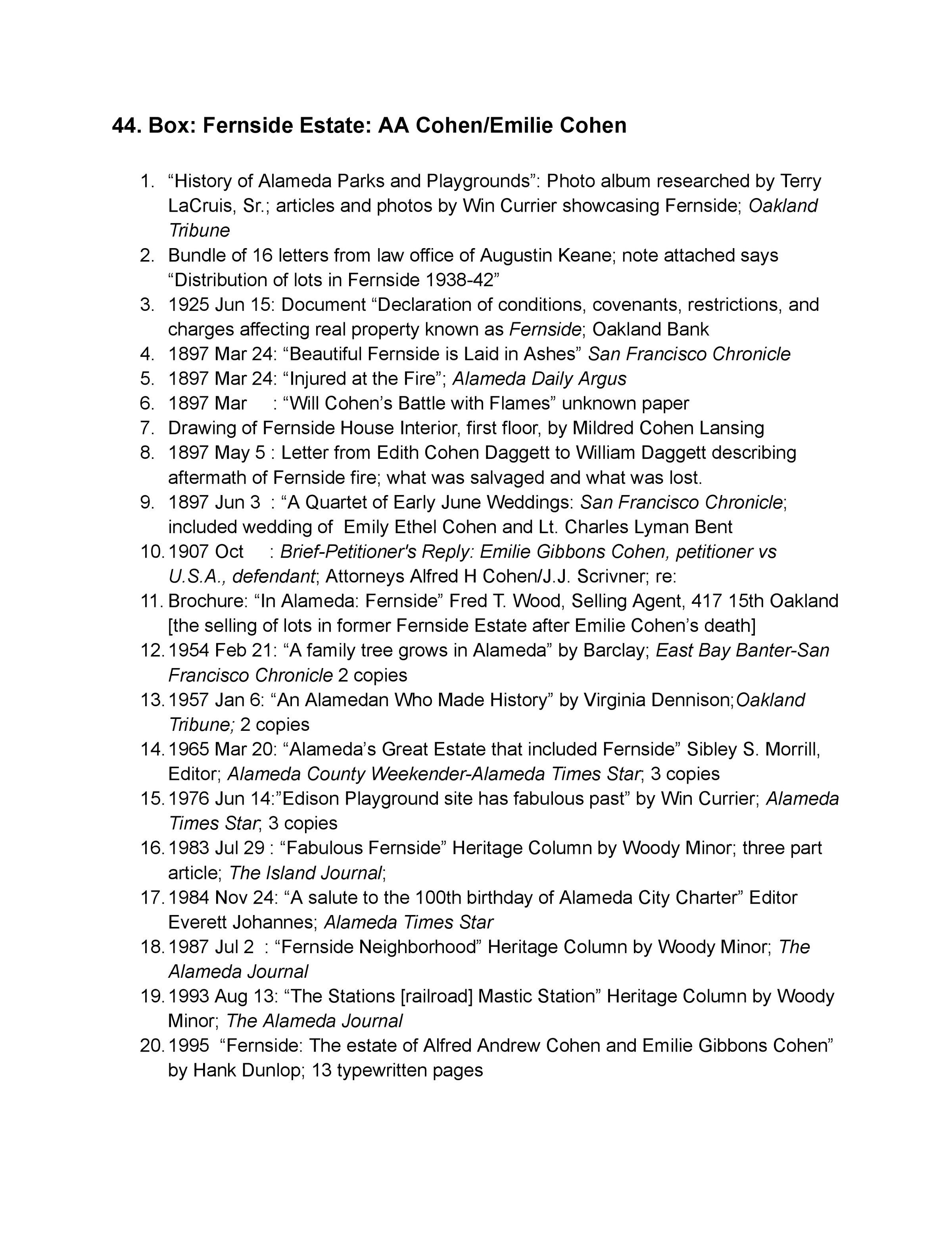 44. Box: Fernside Estate Alameda: History; Dispute with Alameda over Tidal Canal 1900; Division of Fernside after Emilie Cohen's death; Cohens of Fernside and descendantsCreate Date