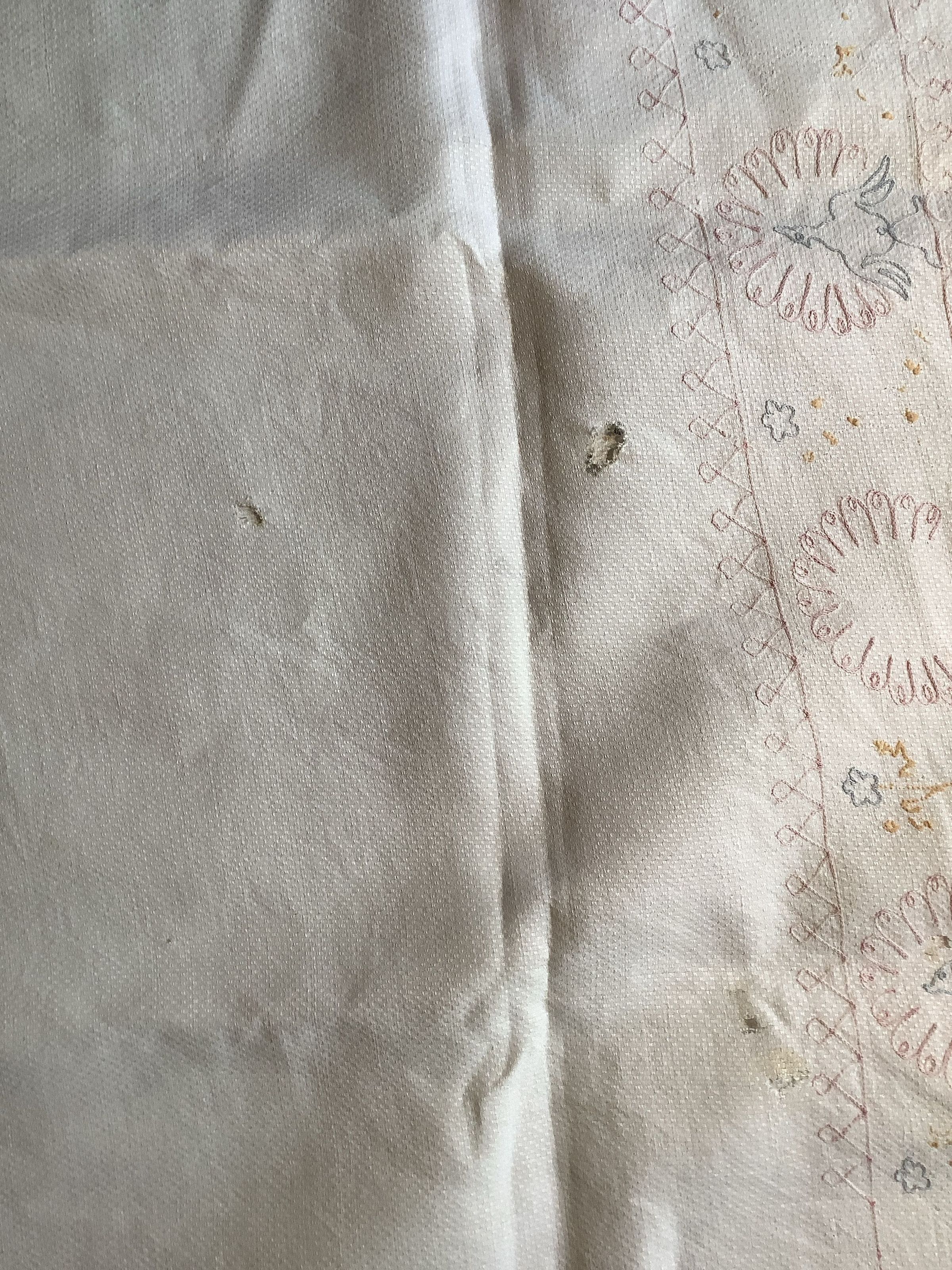 This is a medium sized towel with a bird embroidery detail on both edges. There is a few holes and fraying on the edges. There is also a mended hole