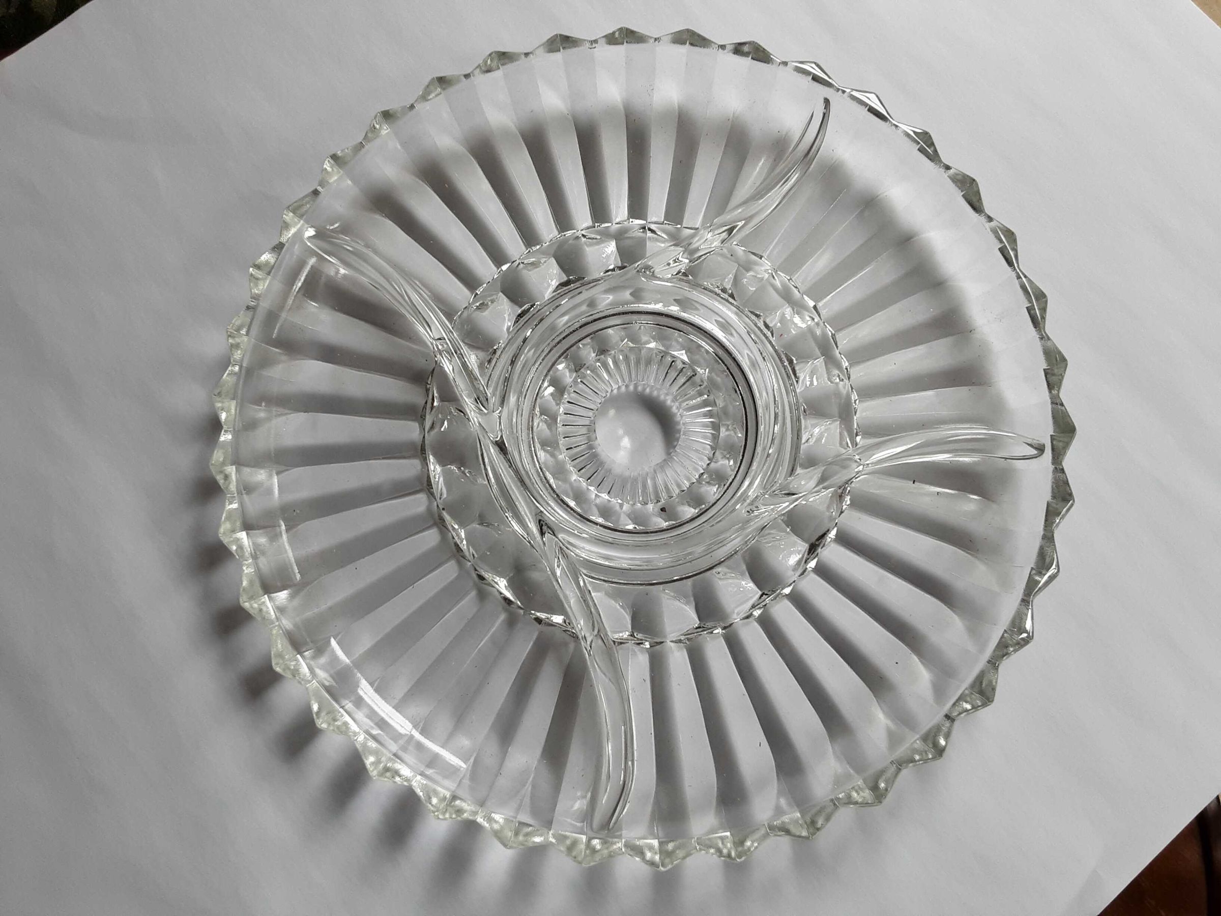 Glass tray for hors d'oeuvres, underside done in a spoke pattern up to edges, and top has portioned off sections for various food items