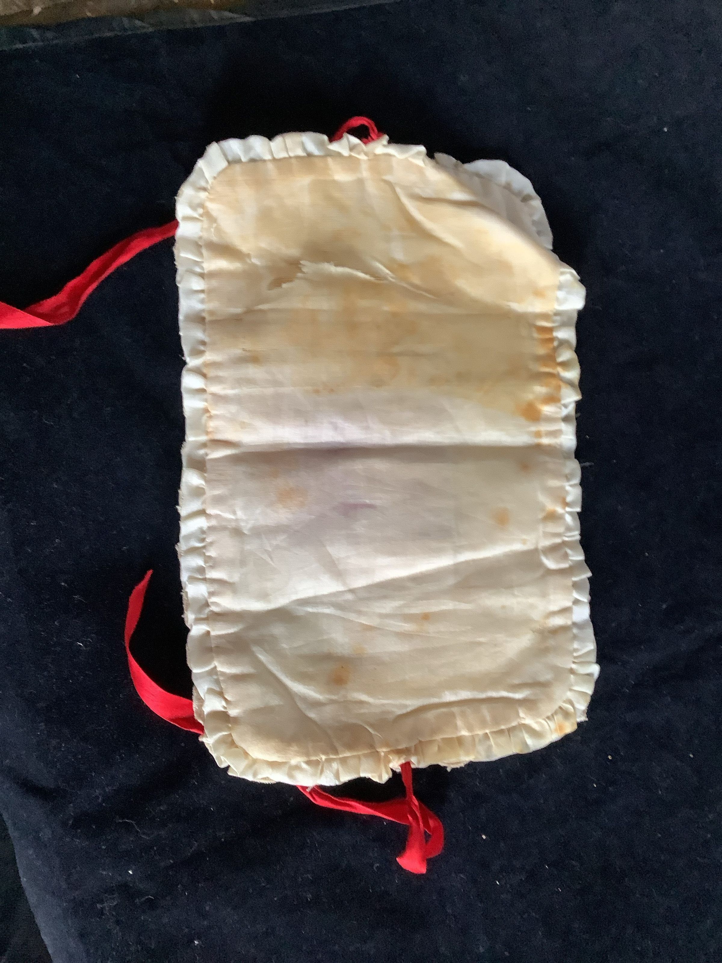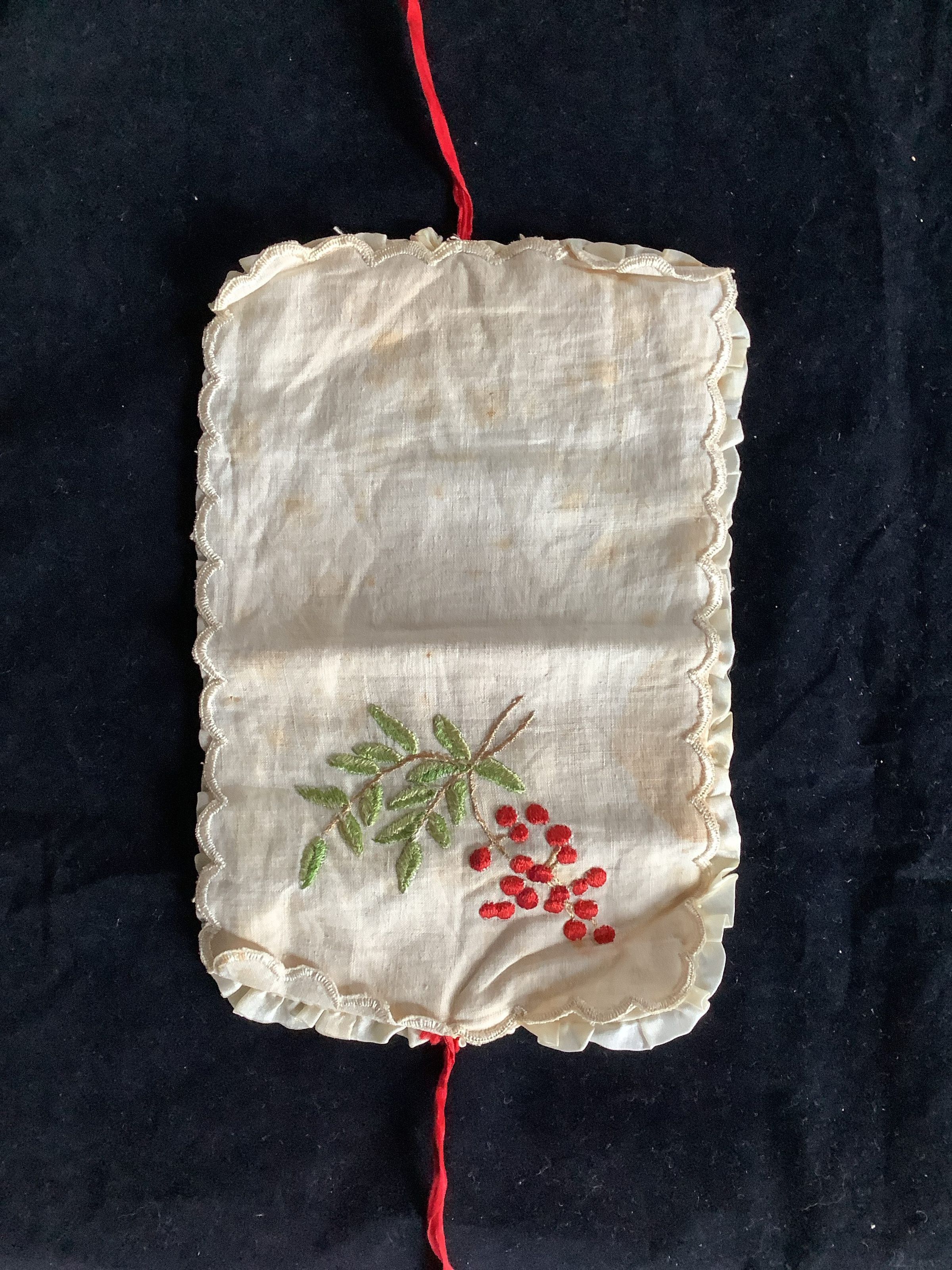 This is a a piece with two layers of fabric, one cotton and silk. There is an embroidered holly branch and two red ribbon ties. There are a few yellowing stains.Create Date