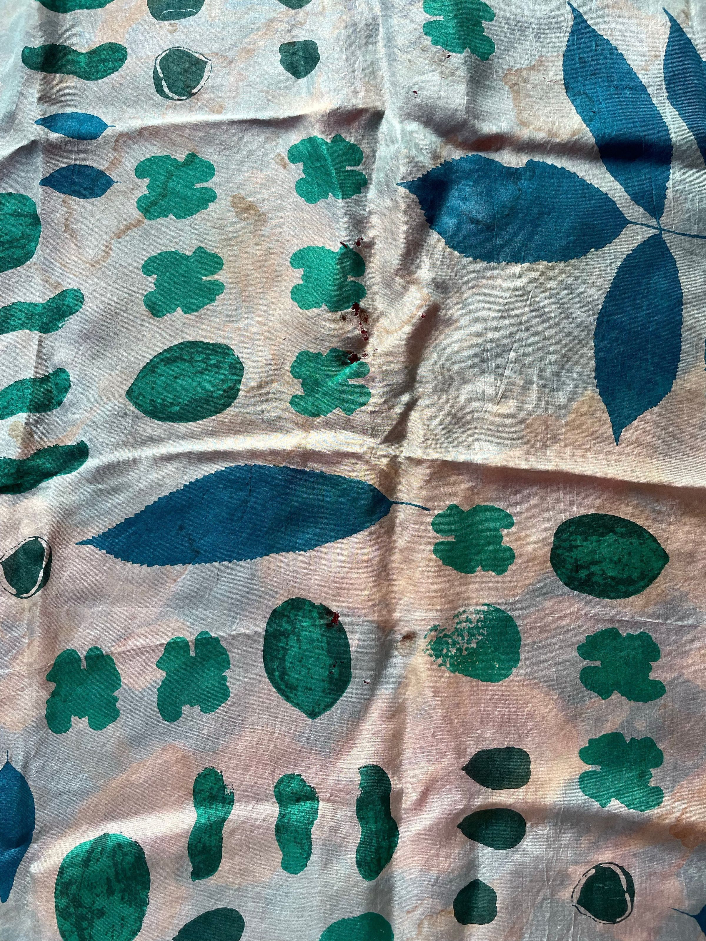 A multicolored patterned scarf in all cool colors with some floral and leaf designs.