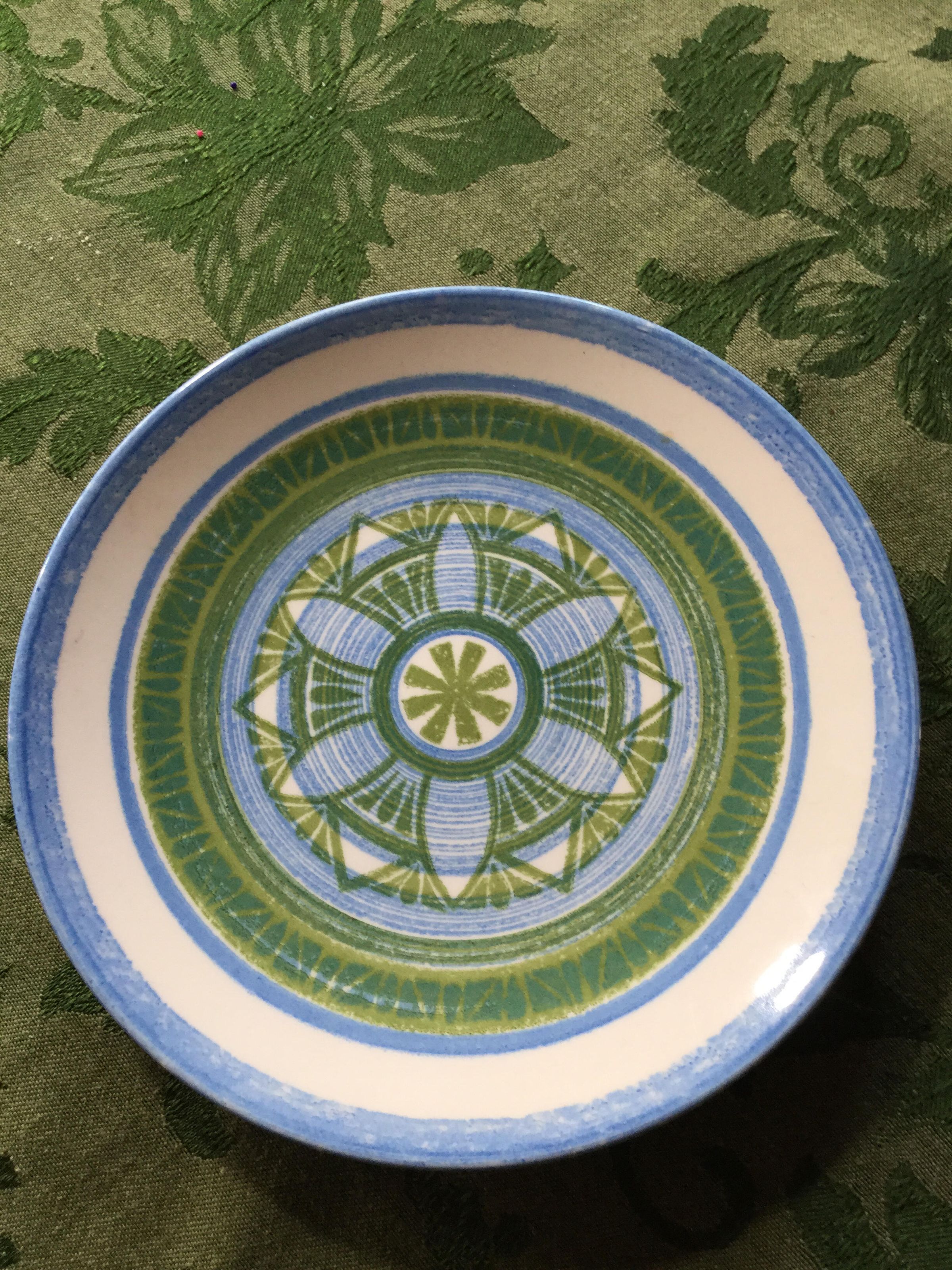 White, blue and green ceramic plate with concentric blue and white around outer edge, moving into green and blue circles towards the middle with a geometric mandala shape in the centerCreate Date
