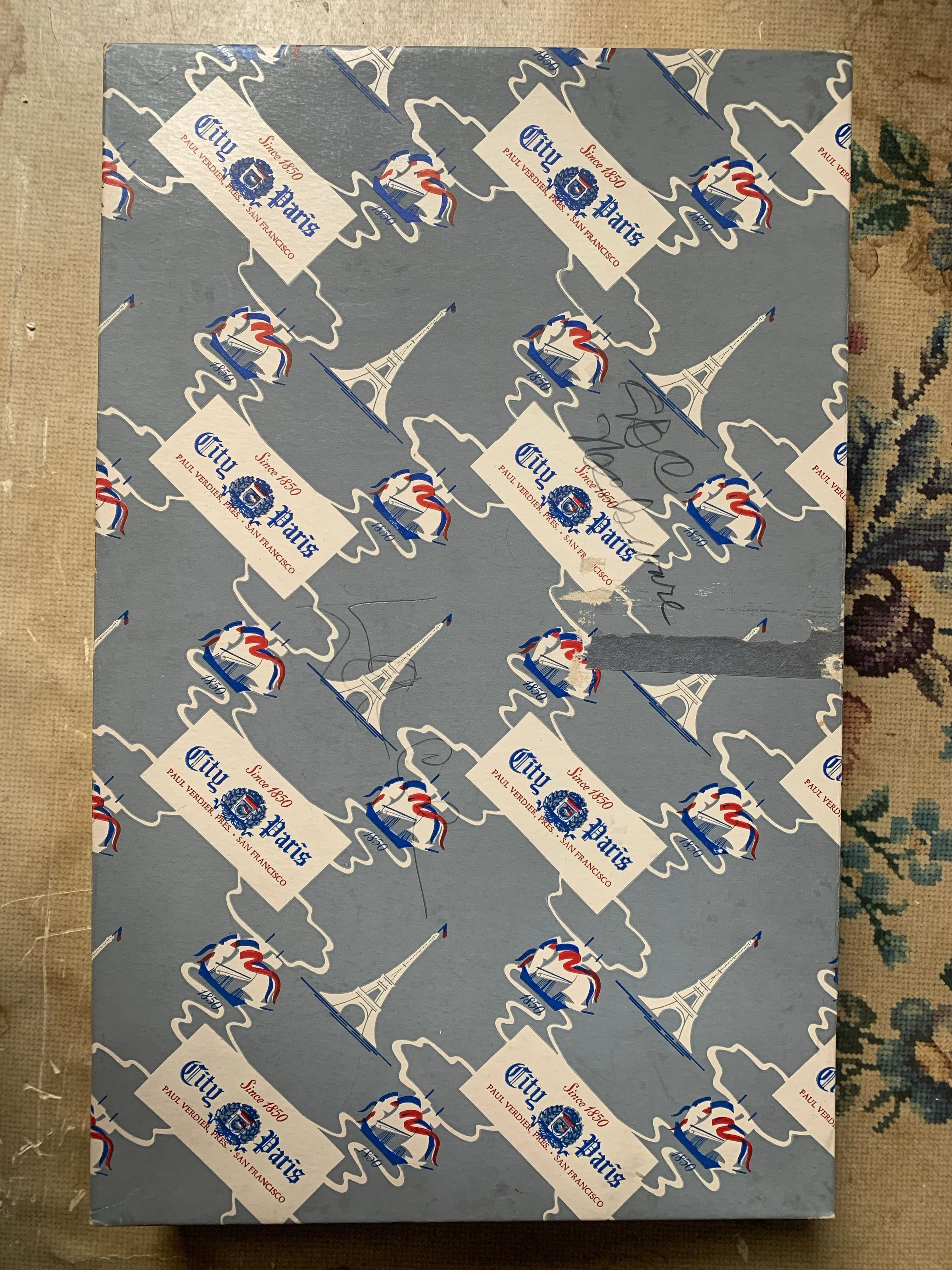Box of lace and fabric neckwear, including other scraps and cut pieces. There is babydoll clothes patterns included with the box. Some of the textile has embroidery and patterns. The color has faded, and there seems to be considerable fold marks on the textiles, but overall condition has been preserved.Inscription/Signature/Marks