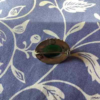 This brooch features a green stone, probably agate or chrysoprase. The stone is set into a silver, art deco style design.