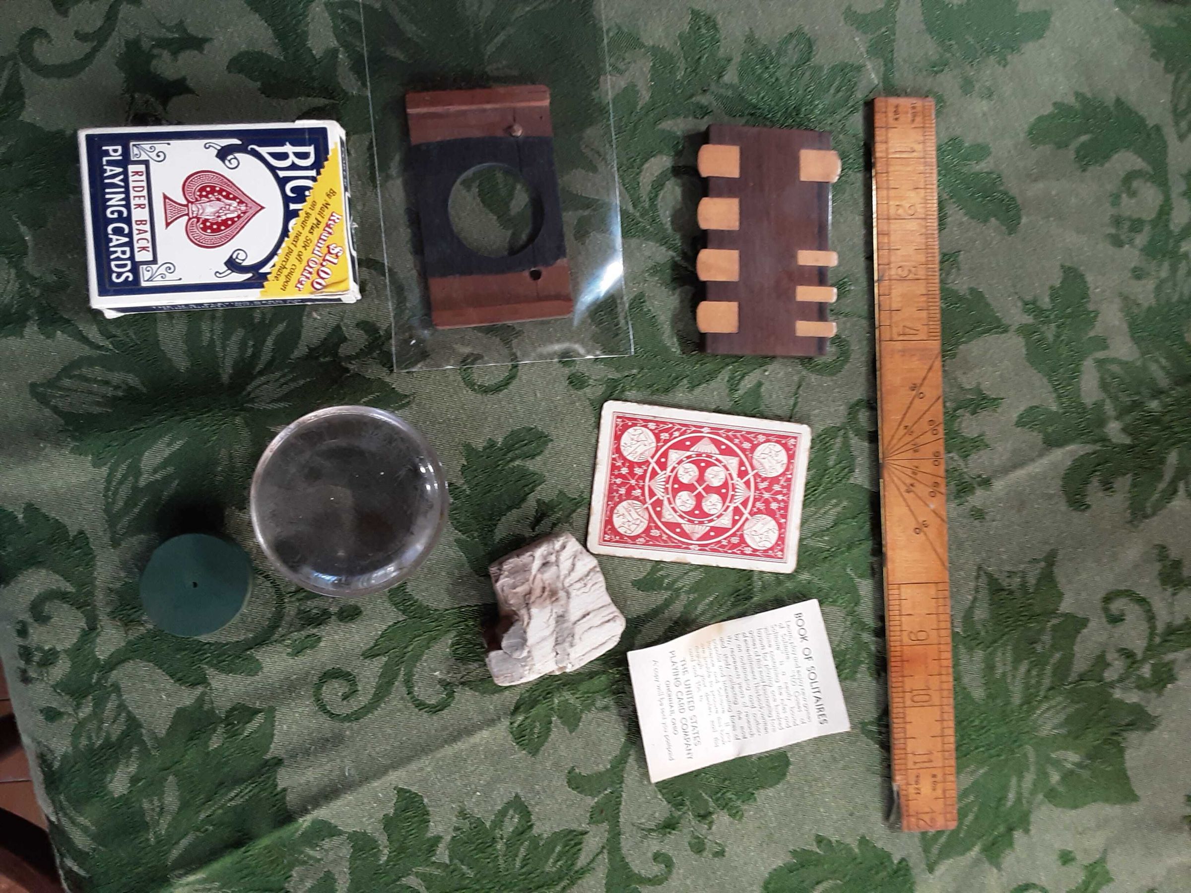 Wooden ruler, cribbage scorekeeper, deck of cards with inside company advert, paperweight, rock, and unidentifiable wooden artifact, rectangular with a circular cut out.Create Date