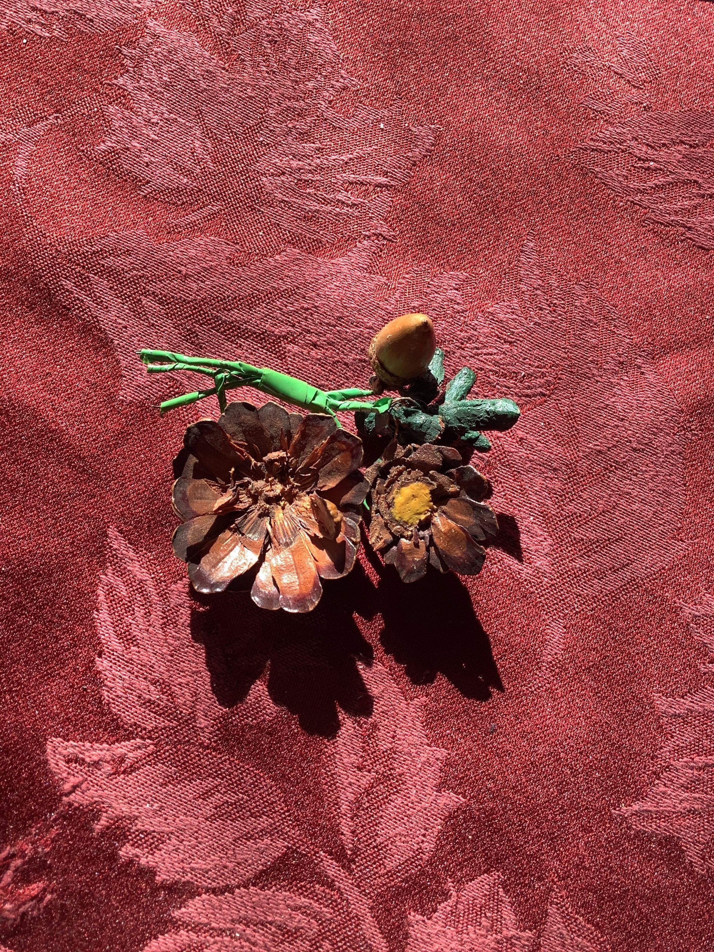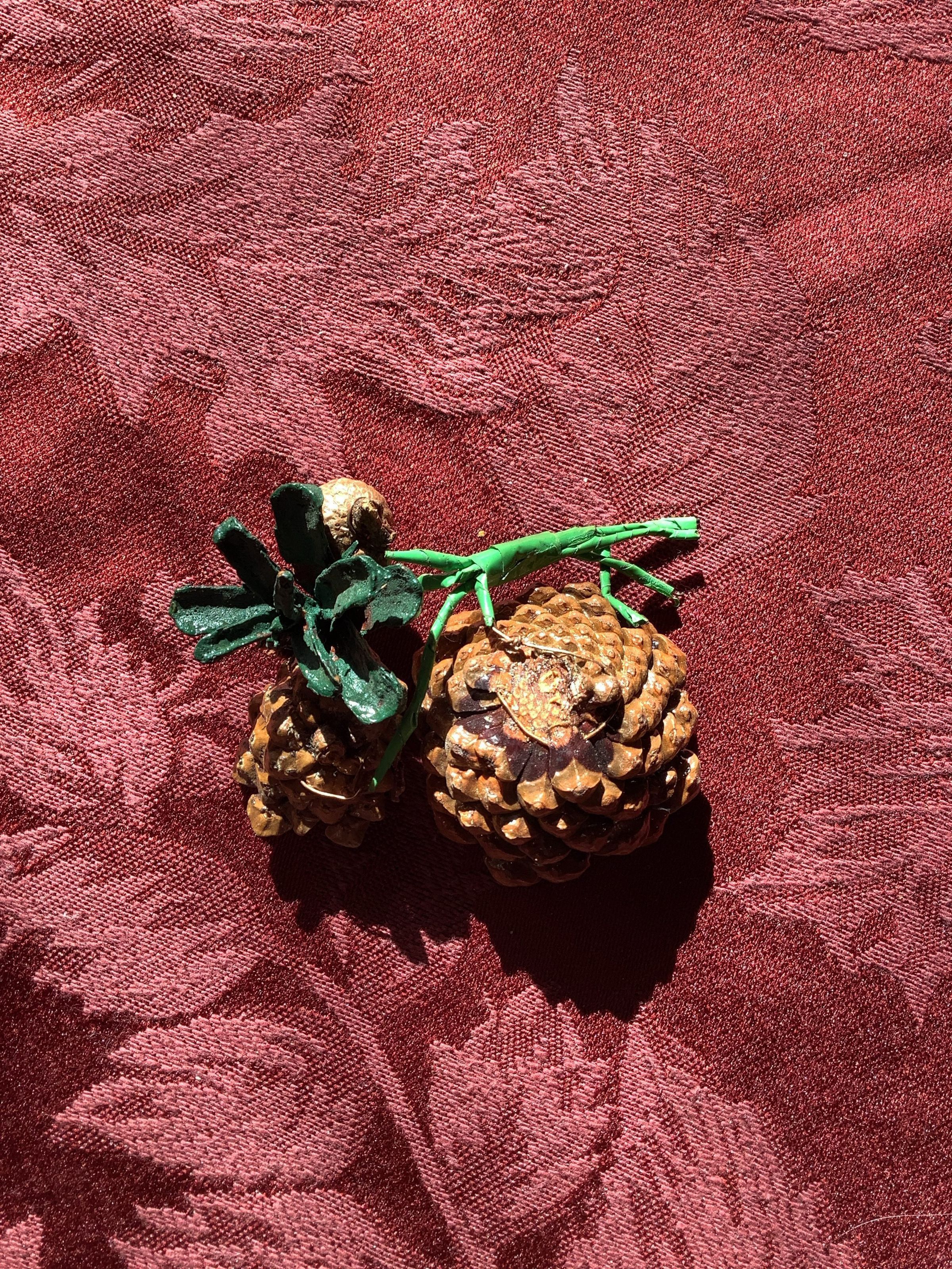 A decorative piece maybe once attached to a pin or clasp. Made out of real pine cones cut in half and painted with a clear gloss. Attached to a painted piece of pine cone and a small acorn by copper wire, which is covered with green tape to give the effect of a stem.Collection
