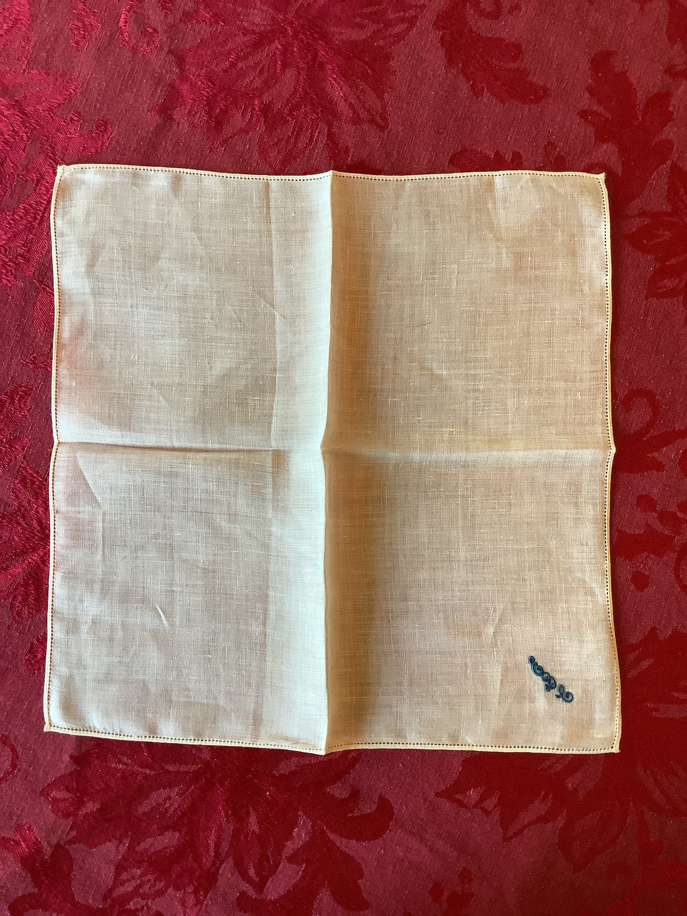A white embroidered handkerchief that’s been initialed “EEC” for Emelita Cohen. The embroidery is done in dark blue thread.
