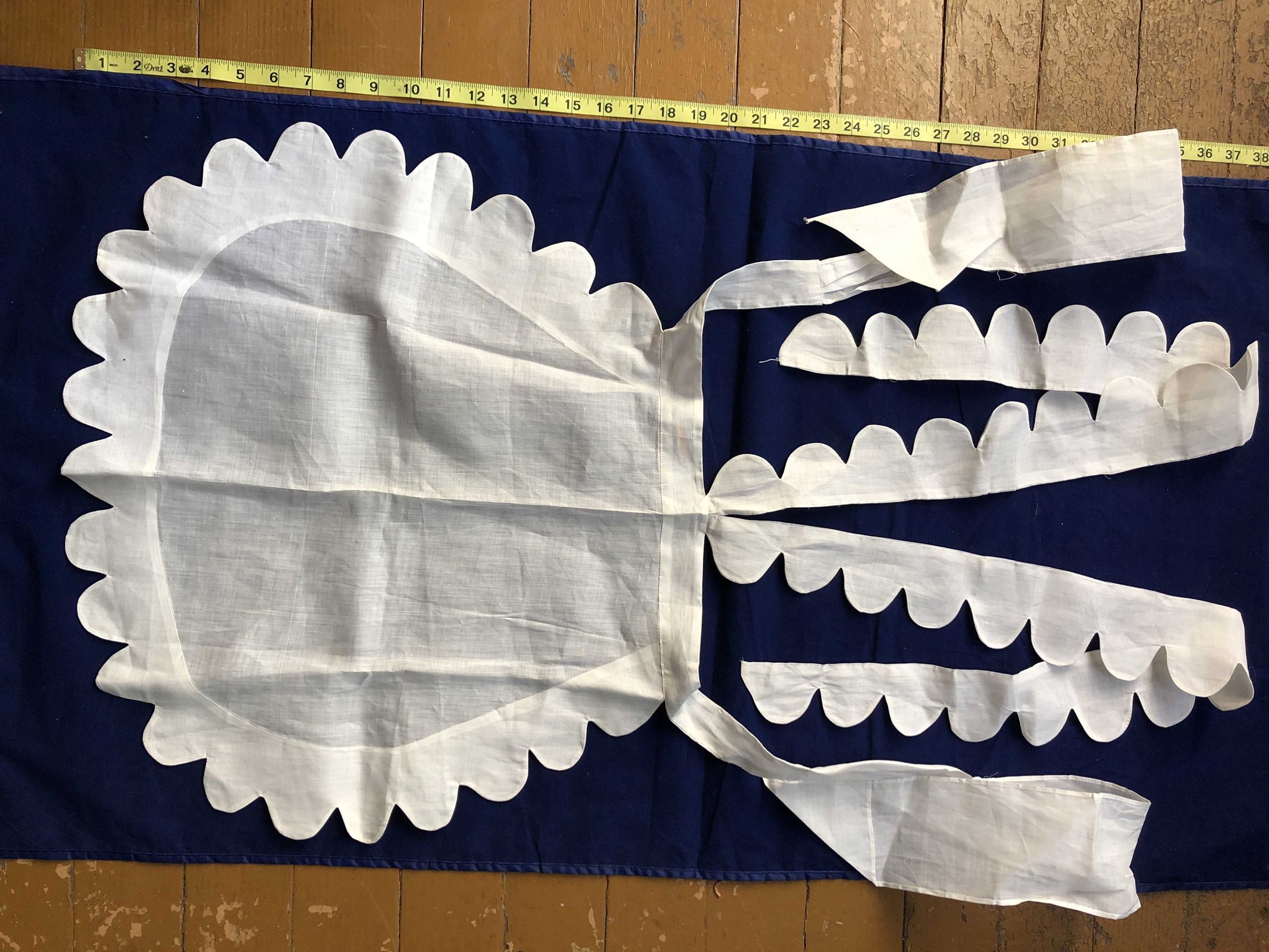 White voile scalloped-edge maid’s apron with scalloped shoulder straps and straight waist ties