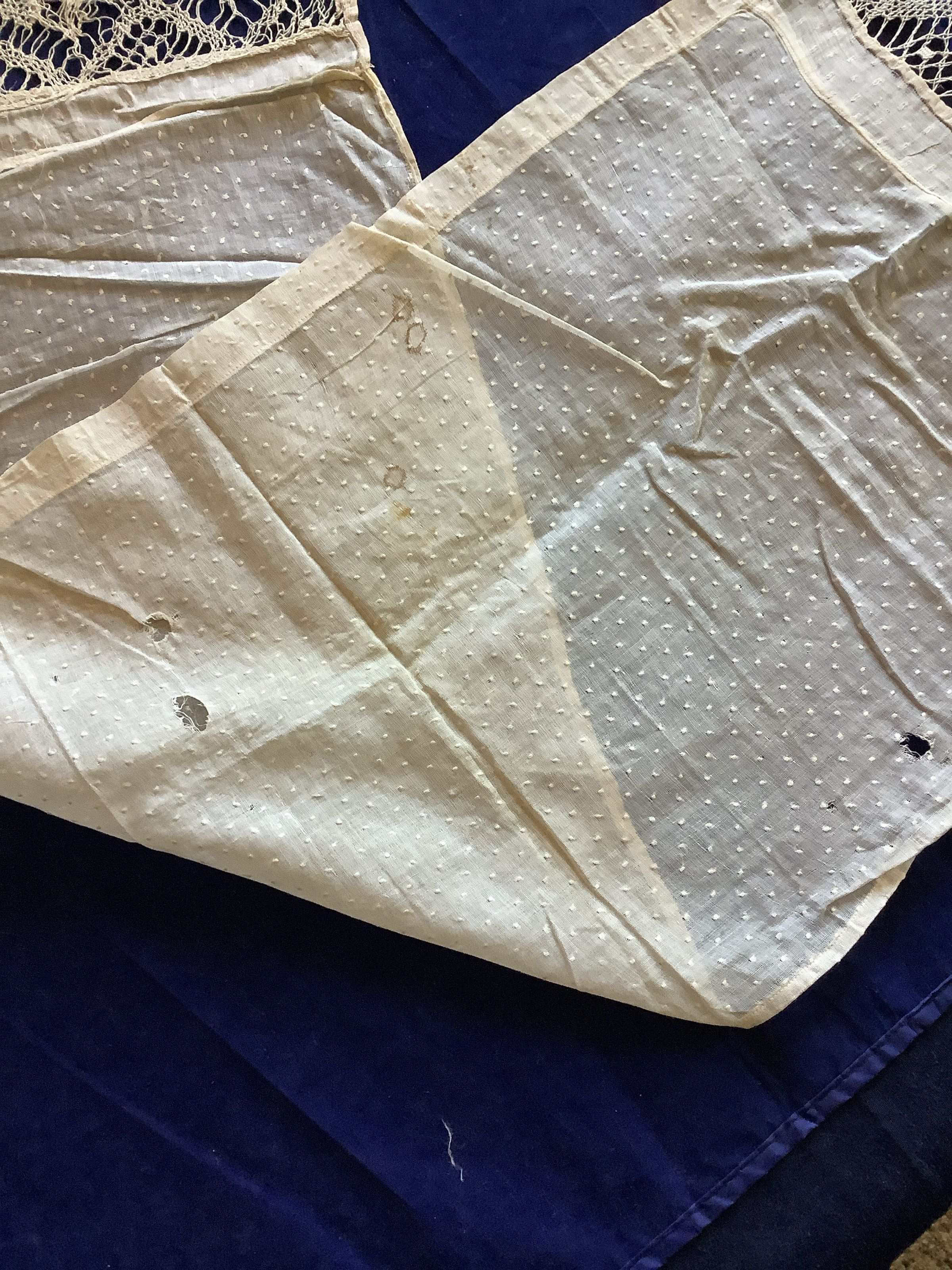 This is a decorative table runner or furniture protector. Made of a thin material and has two lace edges, both of which are hemmed.