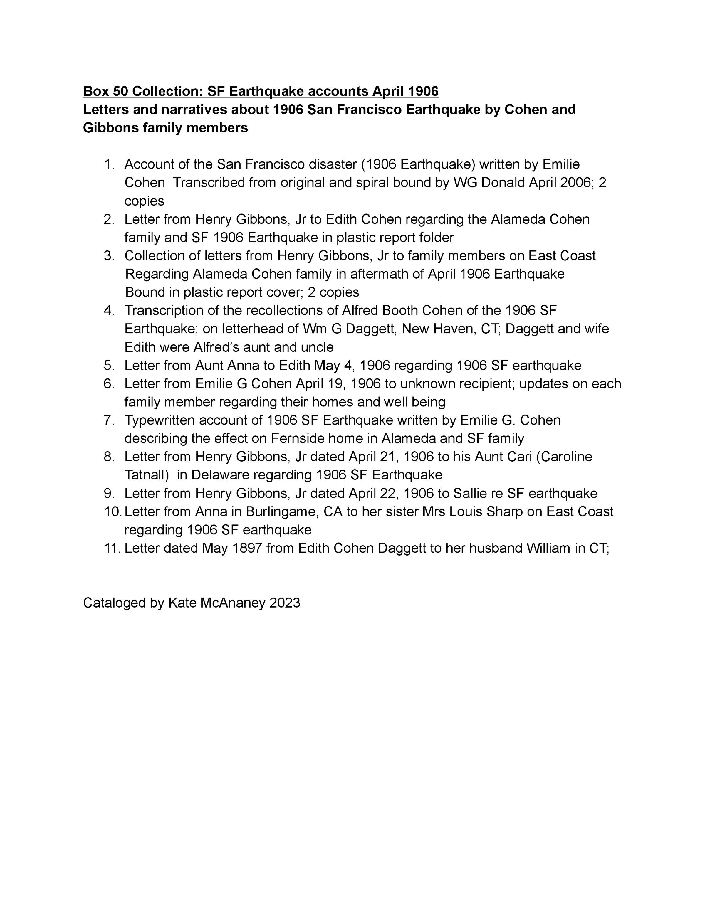 Collection of personal accounts of SF Earthquake 1906: The Cohen families of Alameda and Oakland and the Gibbons families of San Francisco and Alameda wrote personal accounts of the April 18, 1906 to share with their families on the East Coast.Create Date