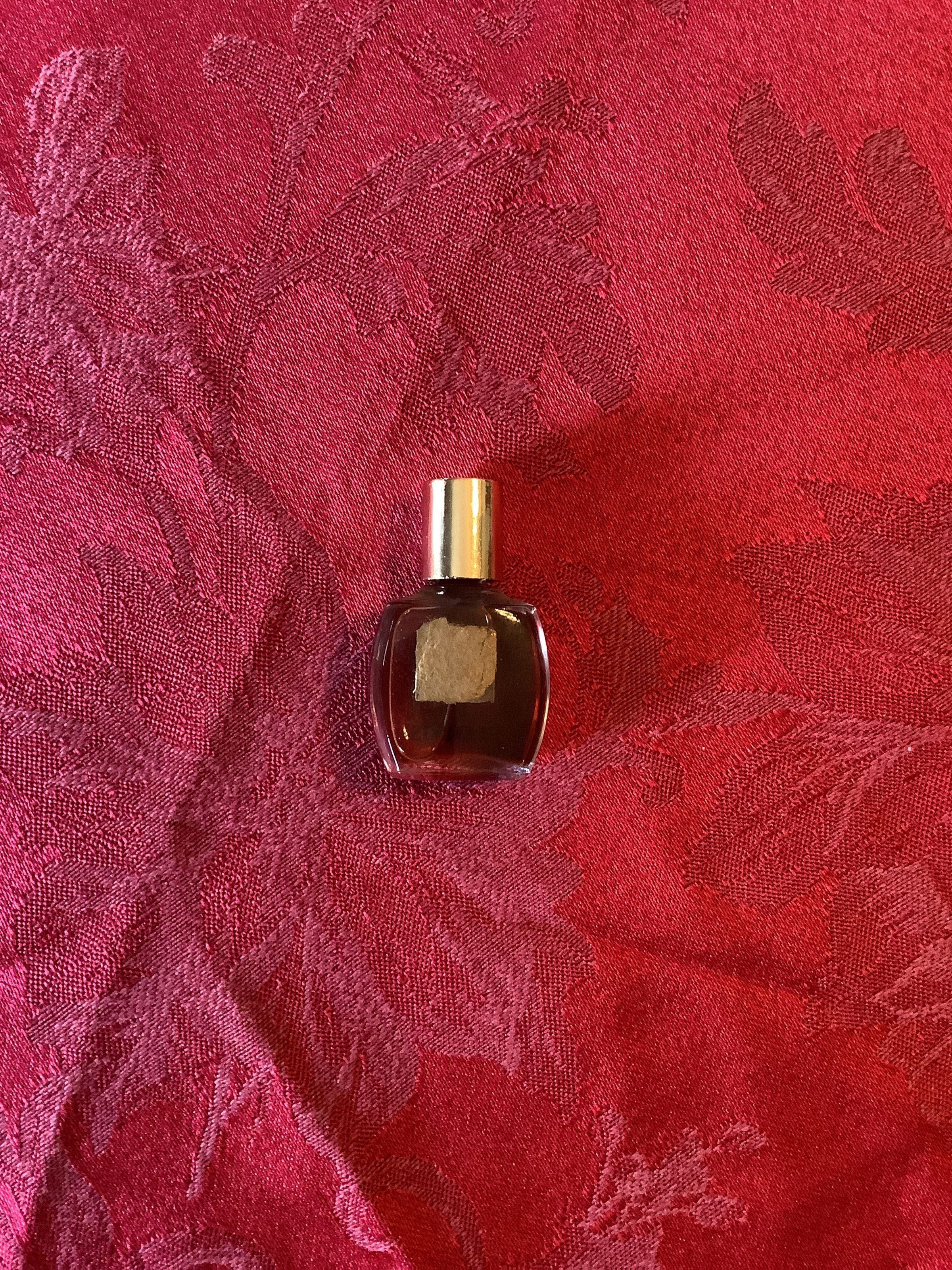Small perfume bottle with amber liquid.