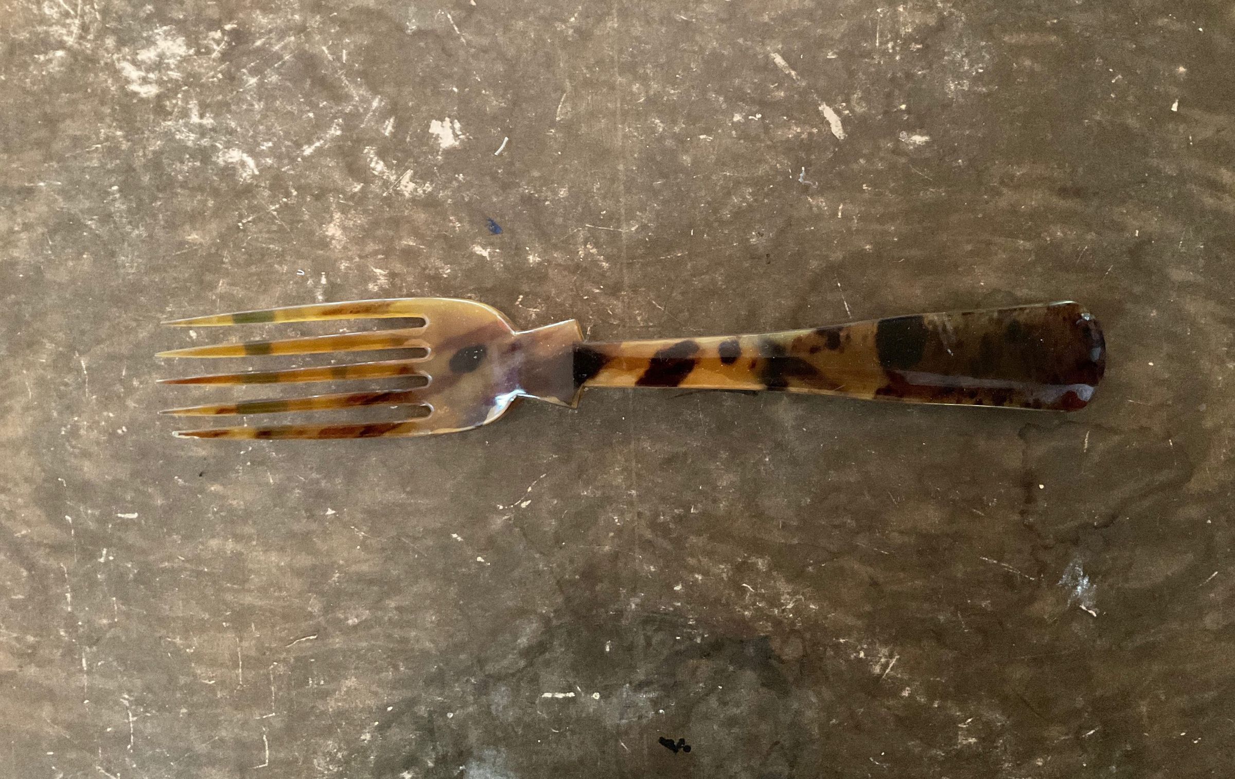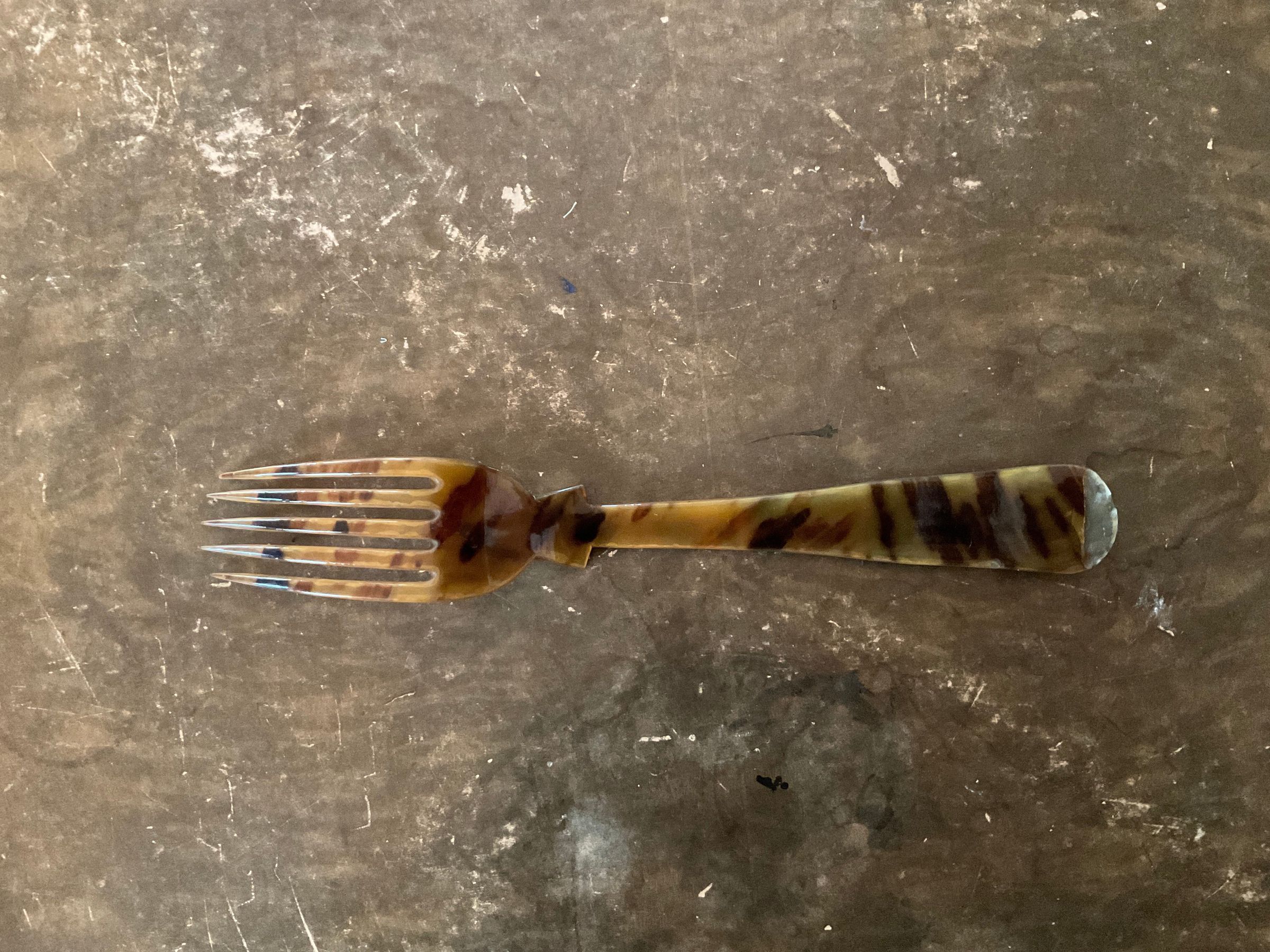 A tortoise shell fork. The fork is large measuring about 6 - 7 inches and is missing a piece on the back.