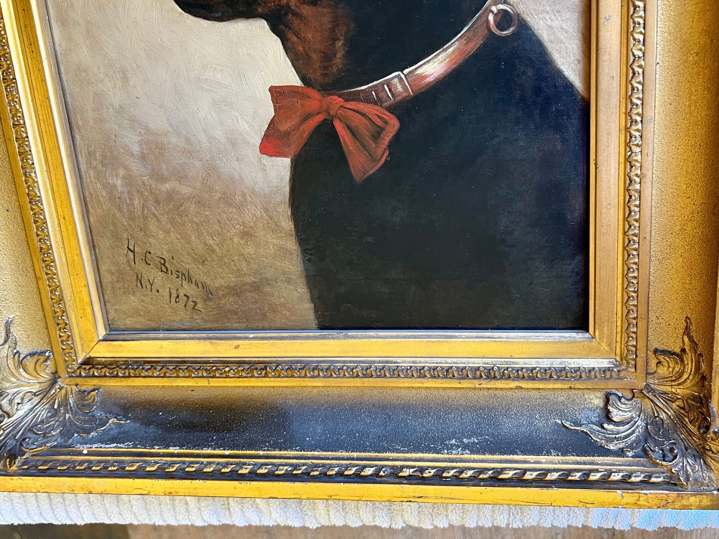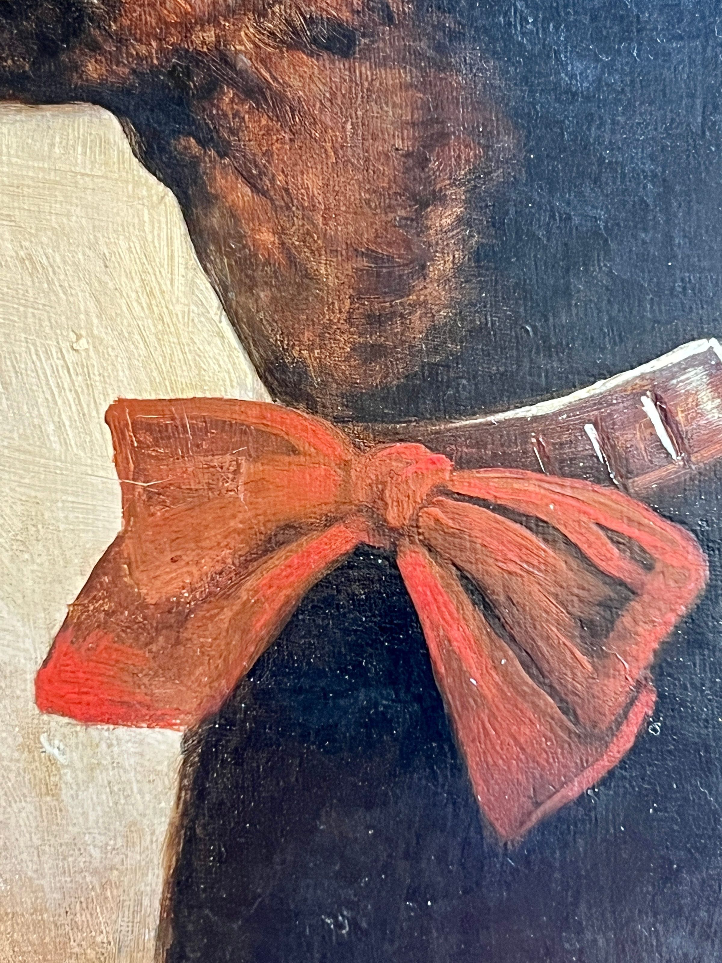 Painting of black dog with brown markings, possibly a Manchester Terrier, wearing a gold collar adorned with a large red bow, and set against a tan background.Collection