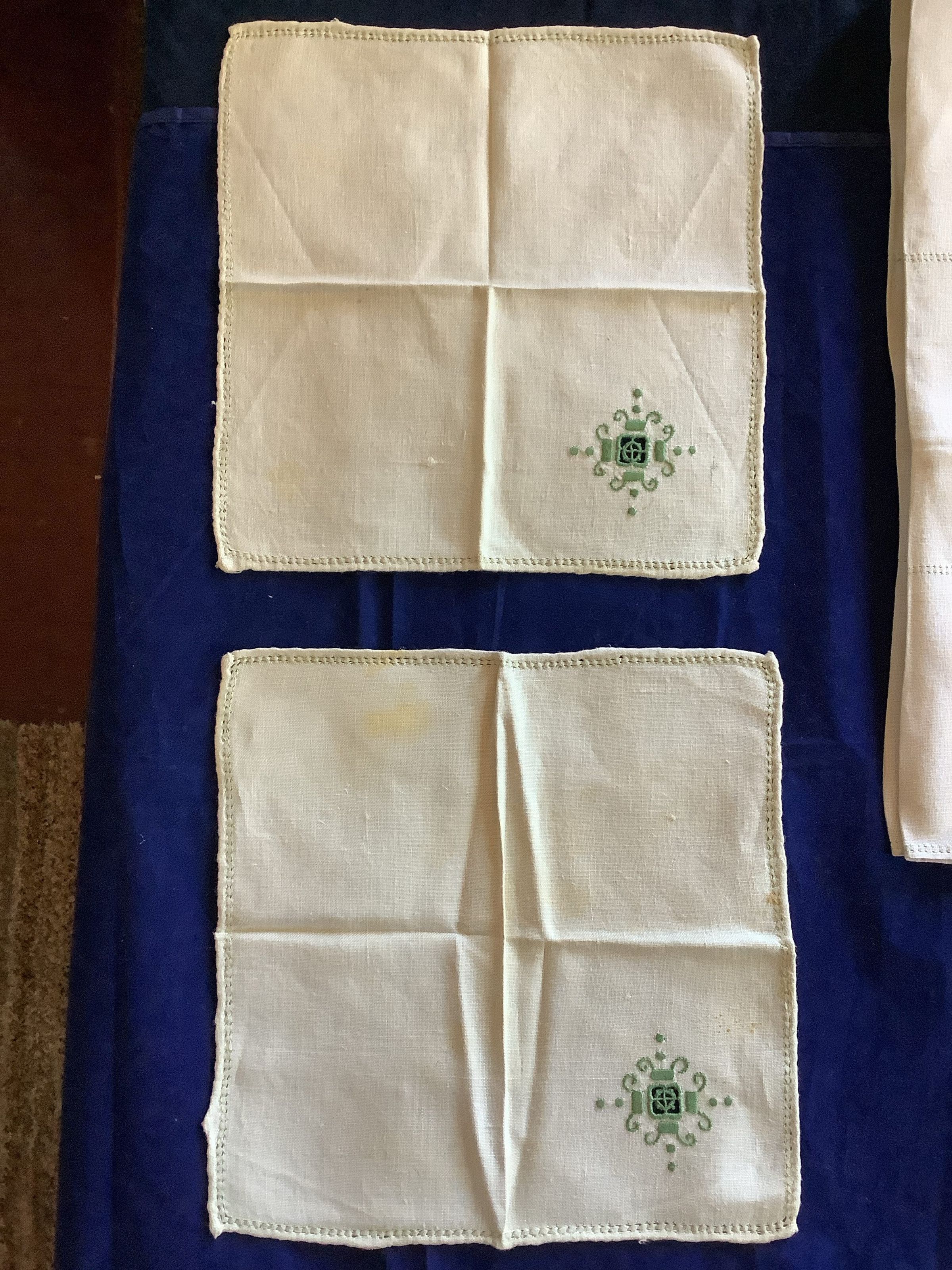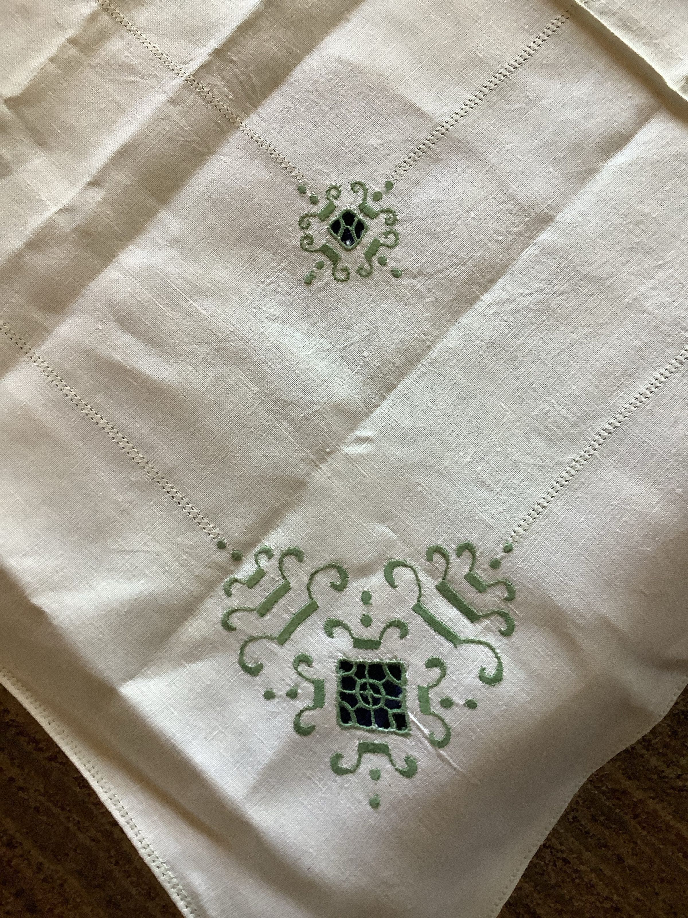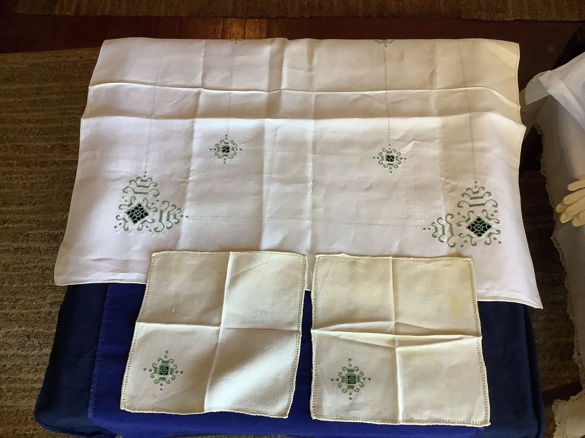 This is a table cloth set with one tablecloth and two napkins. They have similar green embroidery designs and hemmed edges. They are all in good conditionCreate Date