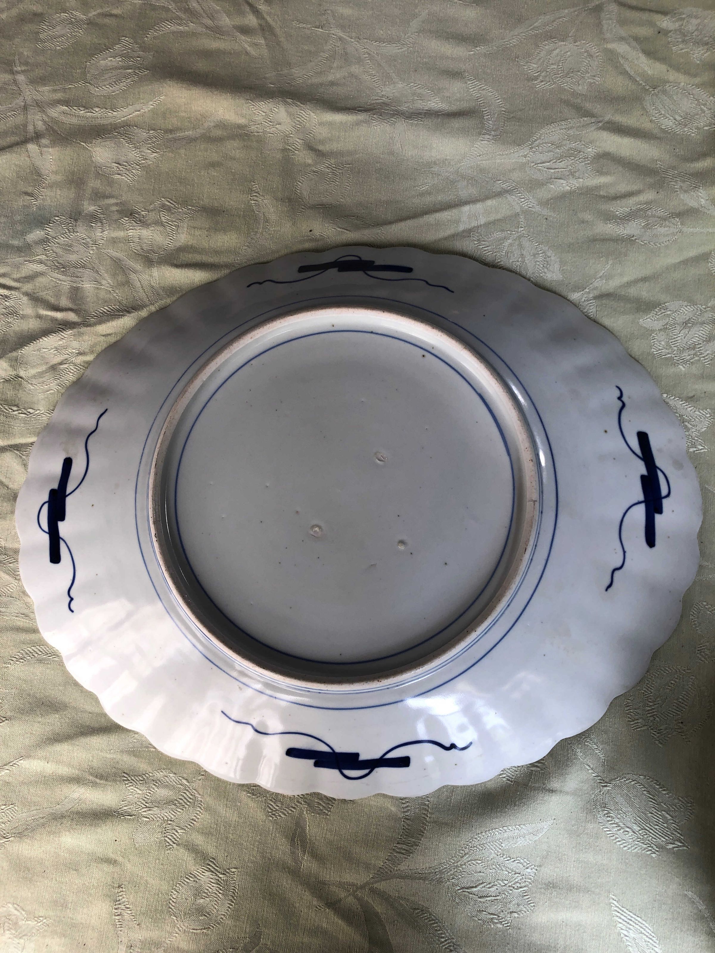 Large ceramic serving platter with scalloped edge, red background with white curlicues and leaves, and white foreground painted with a lively pattern of sections of blue and orange plaid, flowers in orange and blue with a bird trailing ribbons of orange, blue and gray. Bottom has four equidistant markings of dark blue thick solid lines with curves thin lines, as well as blue concentric circles in the middle.Create Date