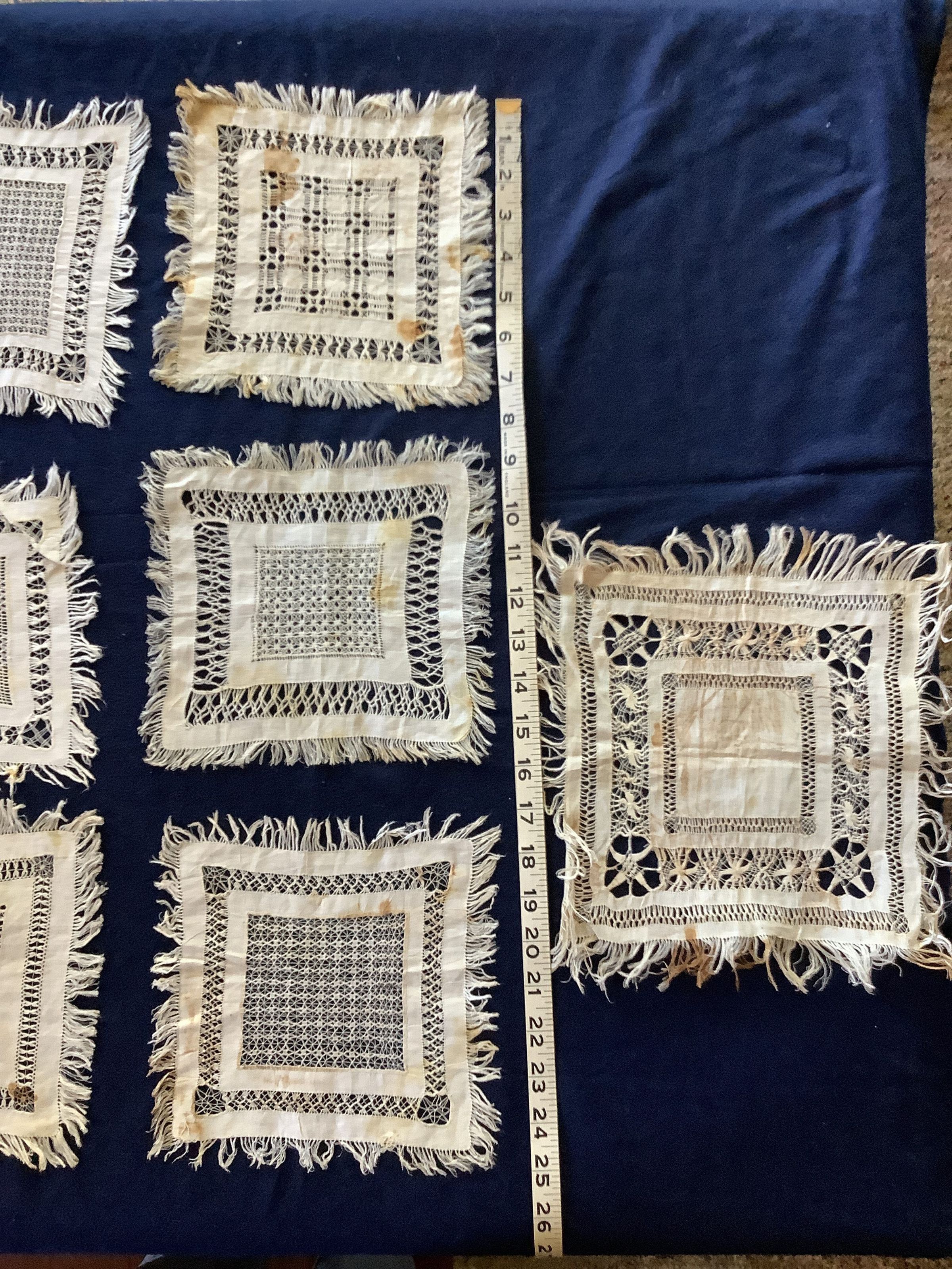 These are 7 square textiles with cotton and woven thread designs, all with tassels around the edges. They all have slightly different designs, one is larger than the rest (see image). There is some creasing and yellowing stains.Create Date