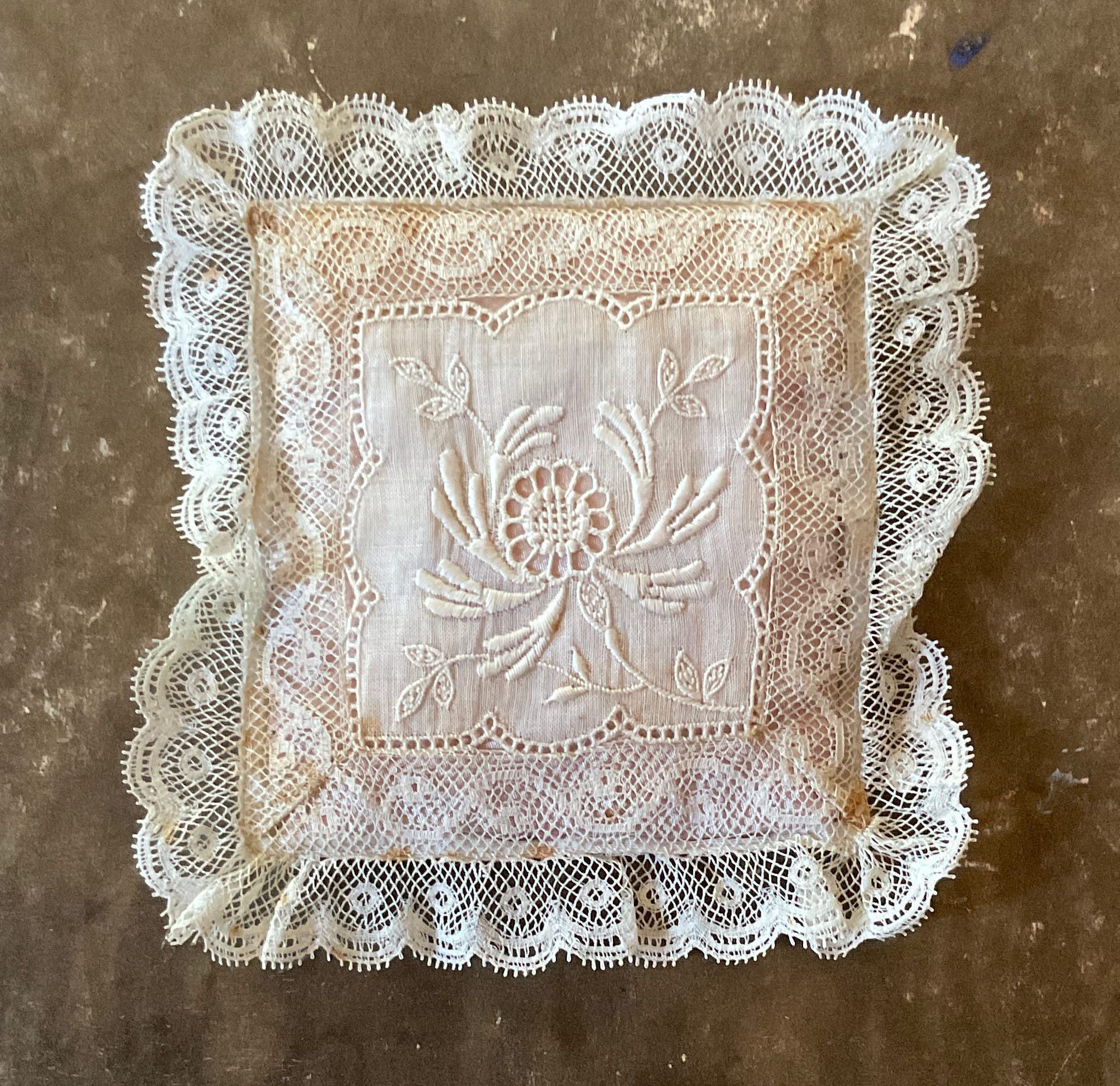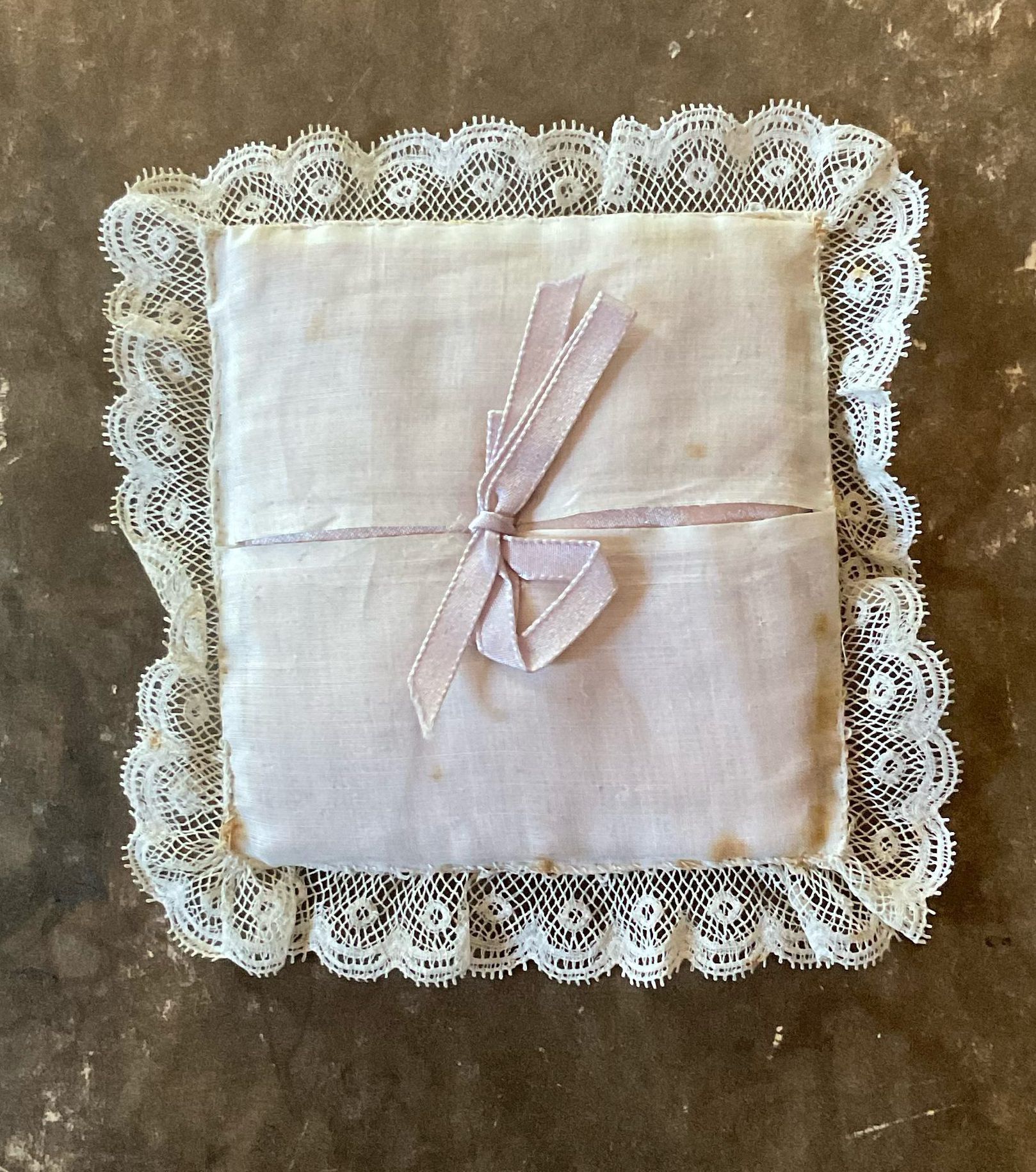 A cream colored sachet, meant to be worn in women's undergarment. The sachet has lace on the front that spills over the borders. In the middle of the alce there is a flower pater surrounded by a border. The back of the sachet has a slit in the middle, to create a pocket. The slit has ribbons on each end to help close-secure the opening. At the moment the ribbons are tied forming a bow.Collection