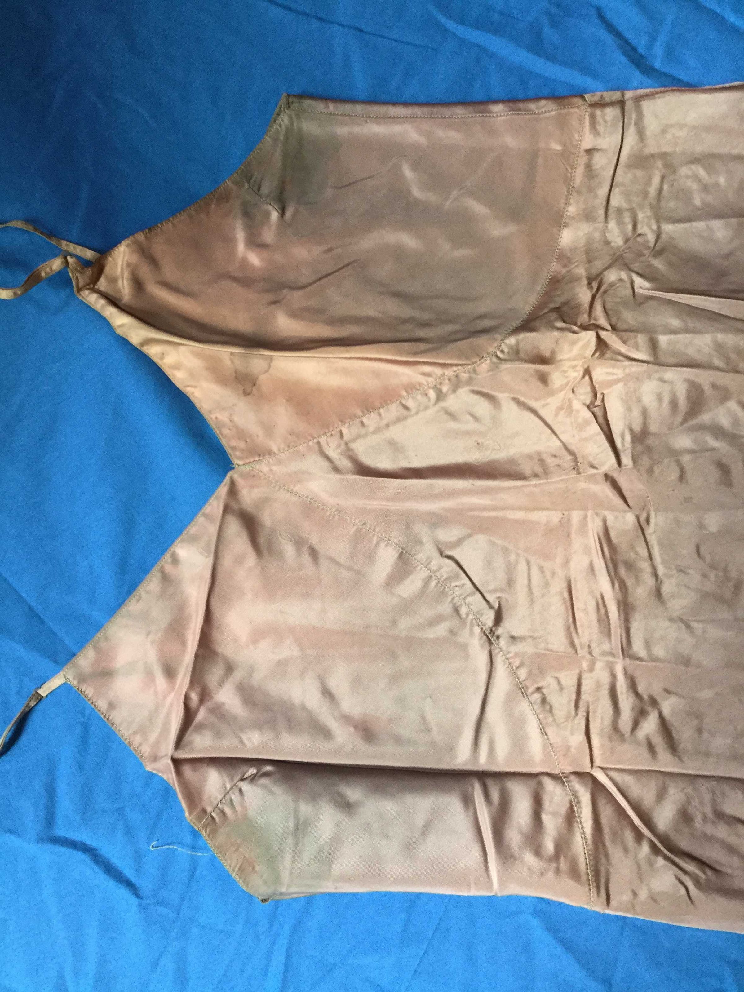 Mauve taffeta (silk?) bias cut slip. Adjustable straps.