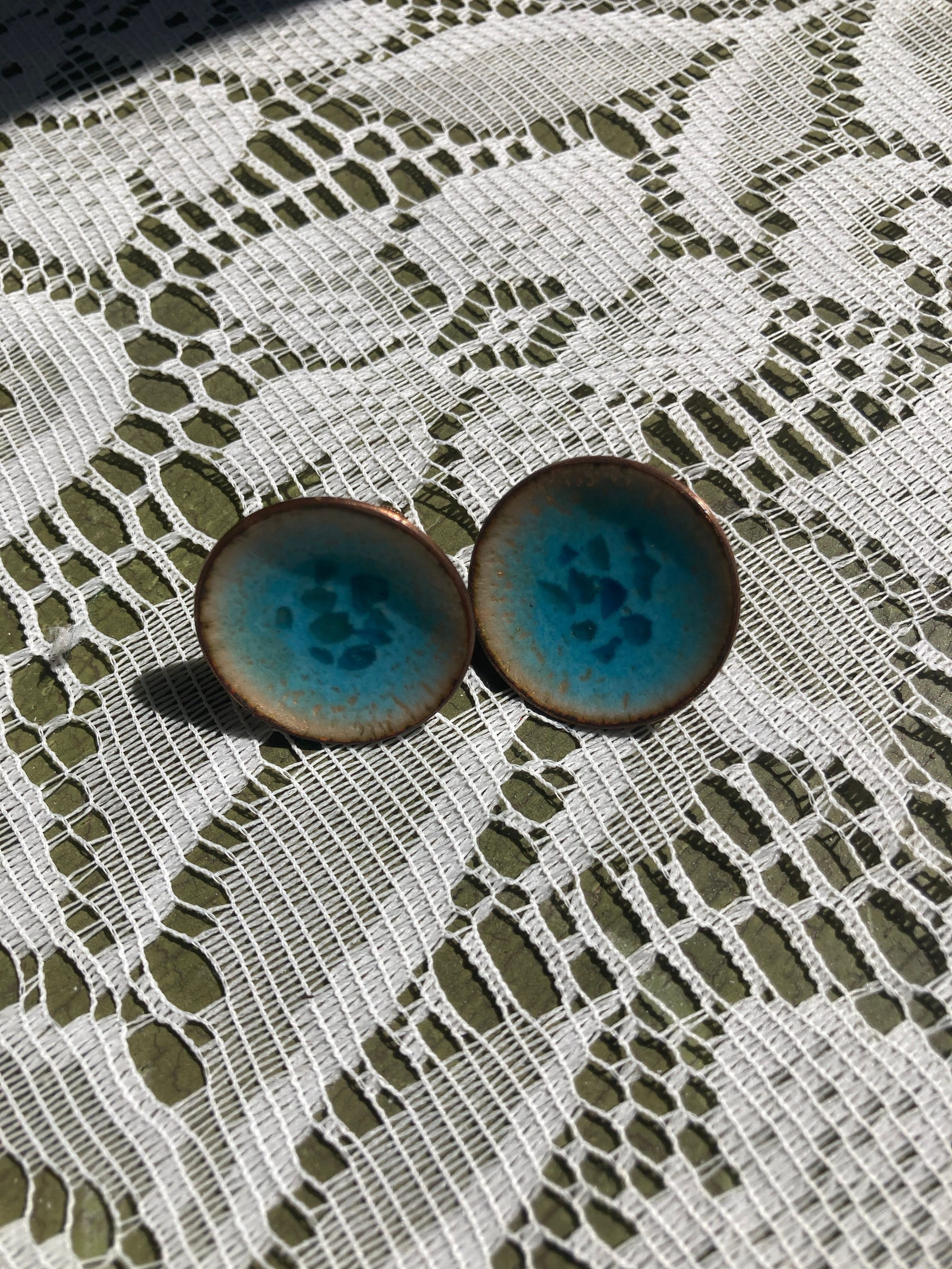 Pair of screw back clip on earrings. Circular shaped, with blue, turquoise and gold flecks on the front. Copper colored on the back.Create Date