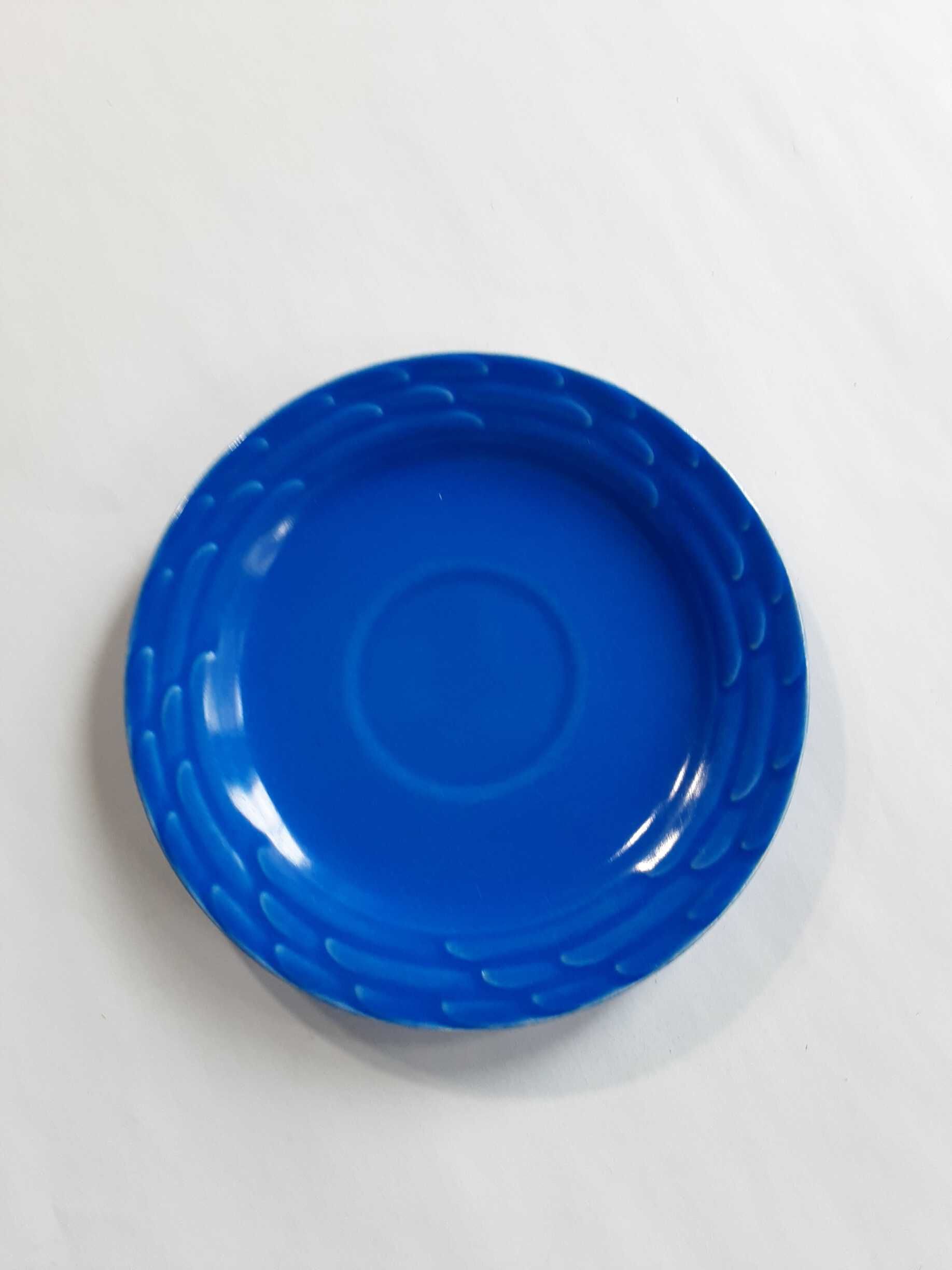 Small bright primary blue ceramic saucer with three rows of curved texture along the outer edge.