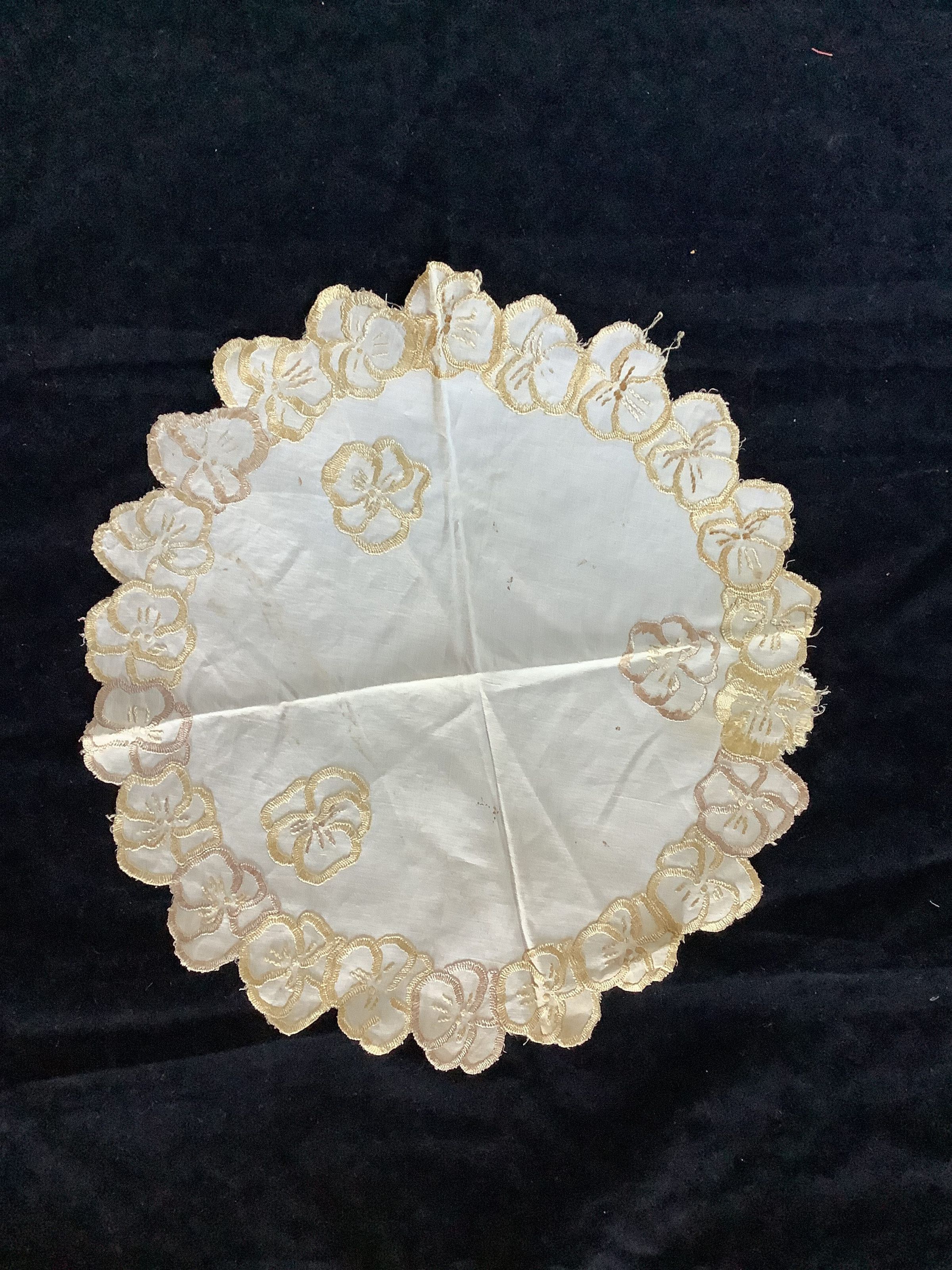 This is a round textile with flowers embroidered around the edge and 3 in the middle.