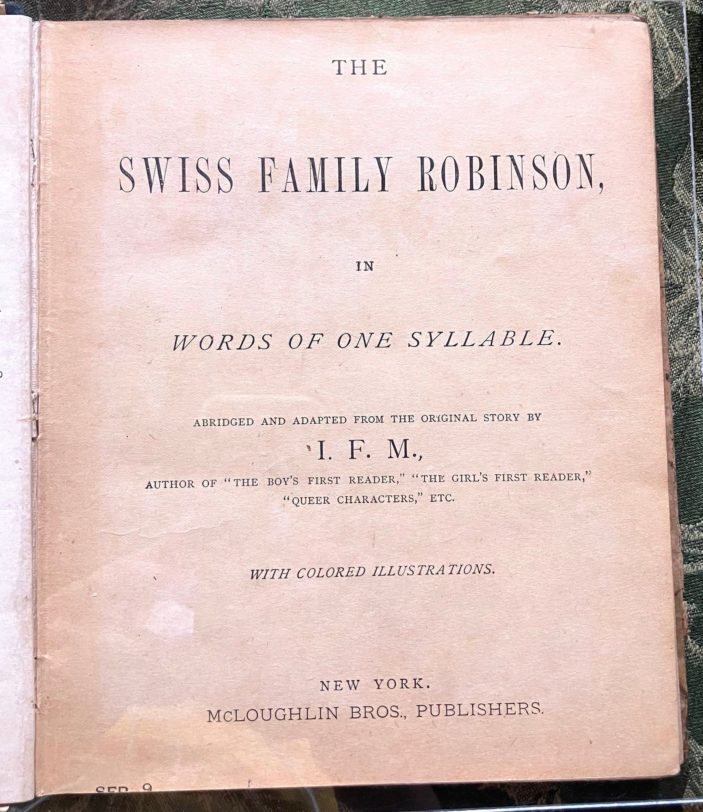 Summary:This fantastic story is a version of the well-known children's tale The Swiss Family Robinson where a family from Switzerland is marooned in the East Indies. The tale follows their battle for survival and attempts to return to the outside world. This particular version is one of a series of 'One Syllable Books' by A.L. Burt of New York, which were selected specially for young people's reading, and told in simple language for the youngest readers.-OCLCInscription/Signature/Marks