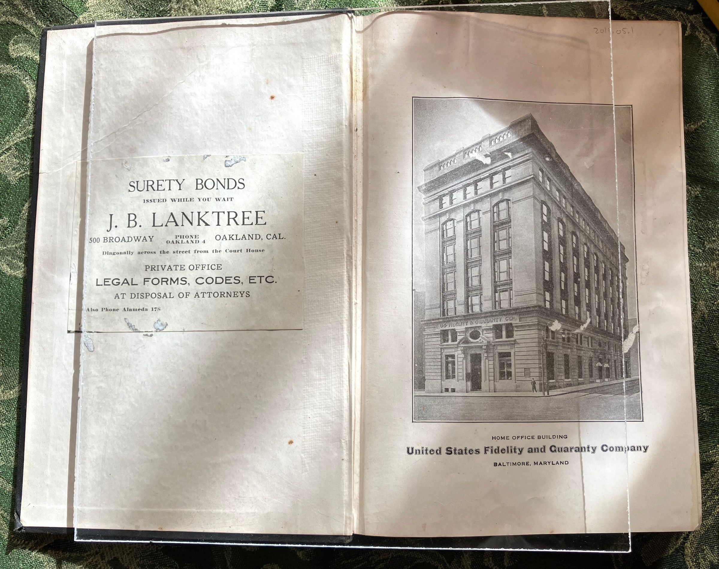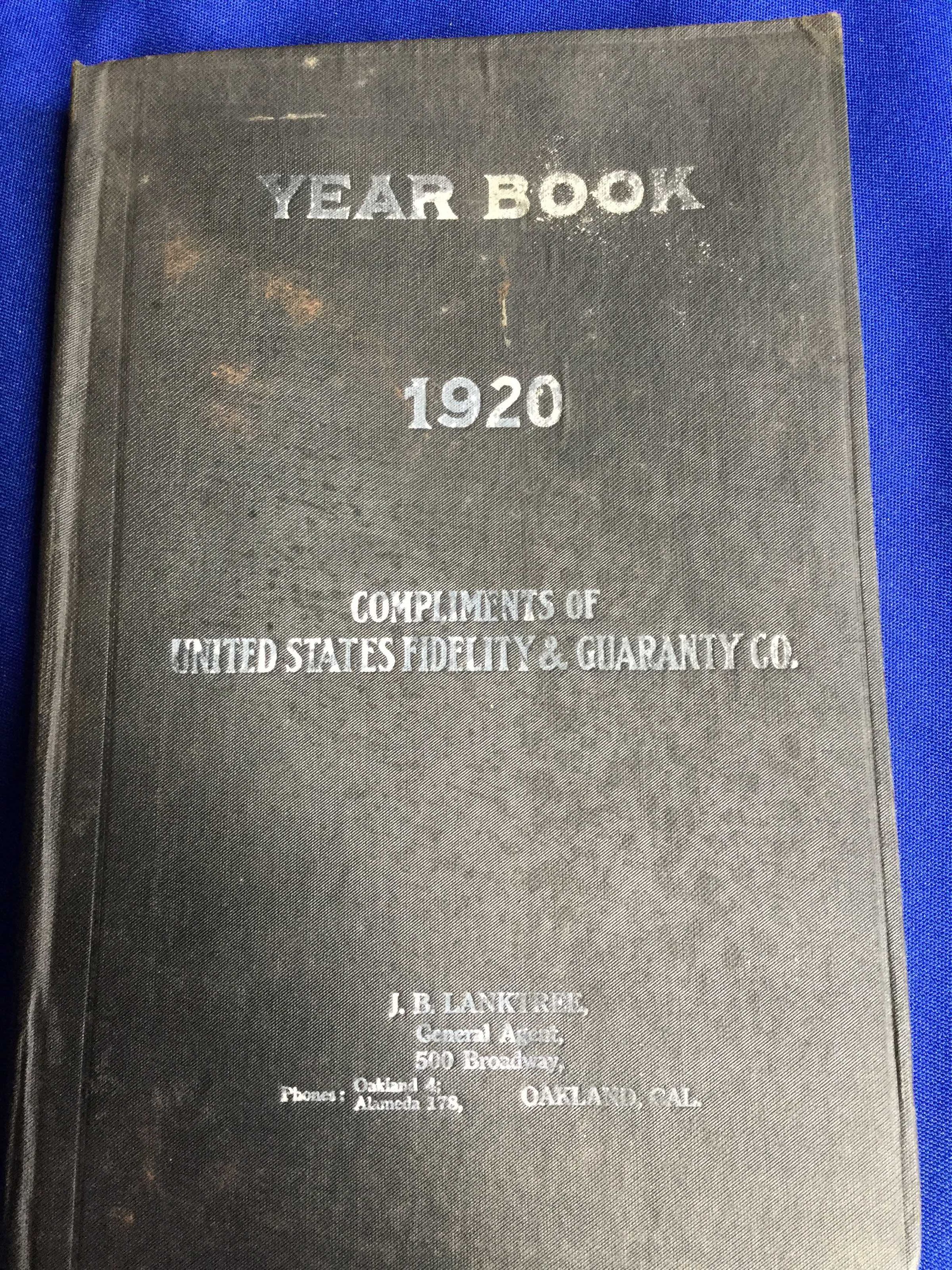 Dated planner style book for tracking job information, compliments of United States Fidelity and Guaranty Co., J.B. Lanktree, General Agent, 500 Broadway. Oakland, CA