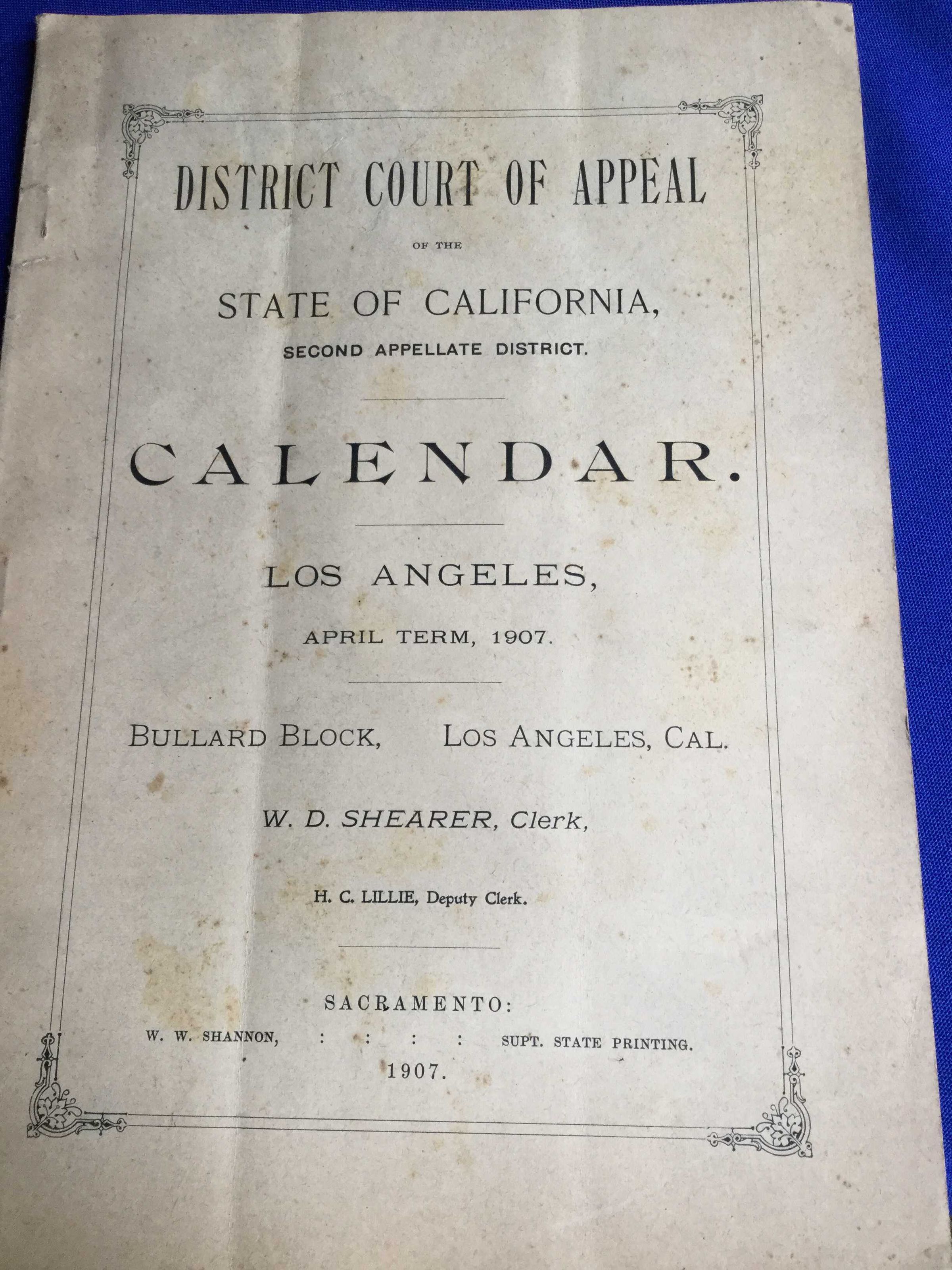 Schedule/Calendar for State of California District Court of Appeal in Los Angeles- April term 1907; PHYSDESC: 25.5cm x 18cm; 10 pages.Collection
