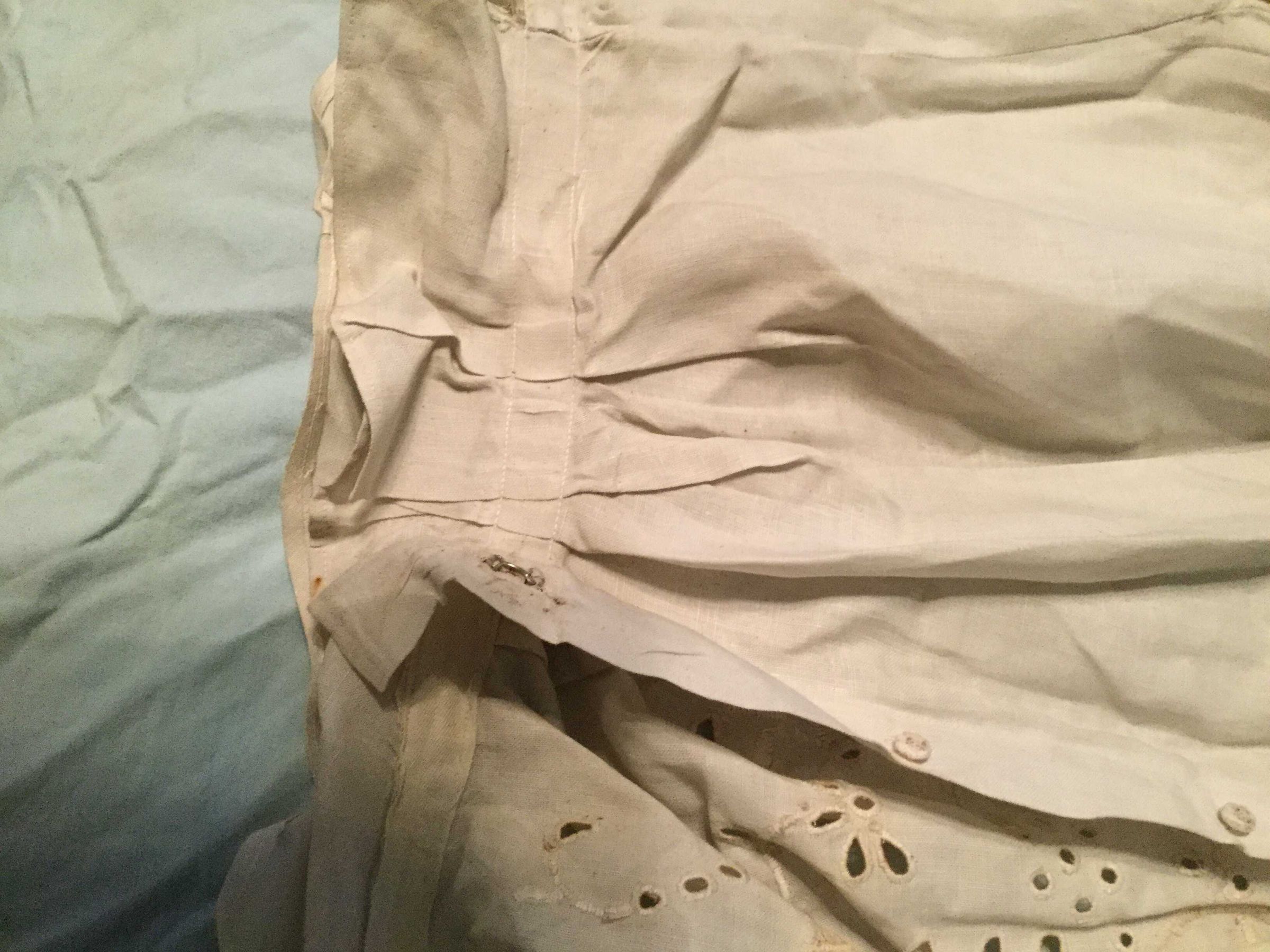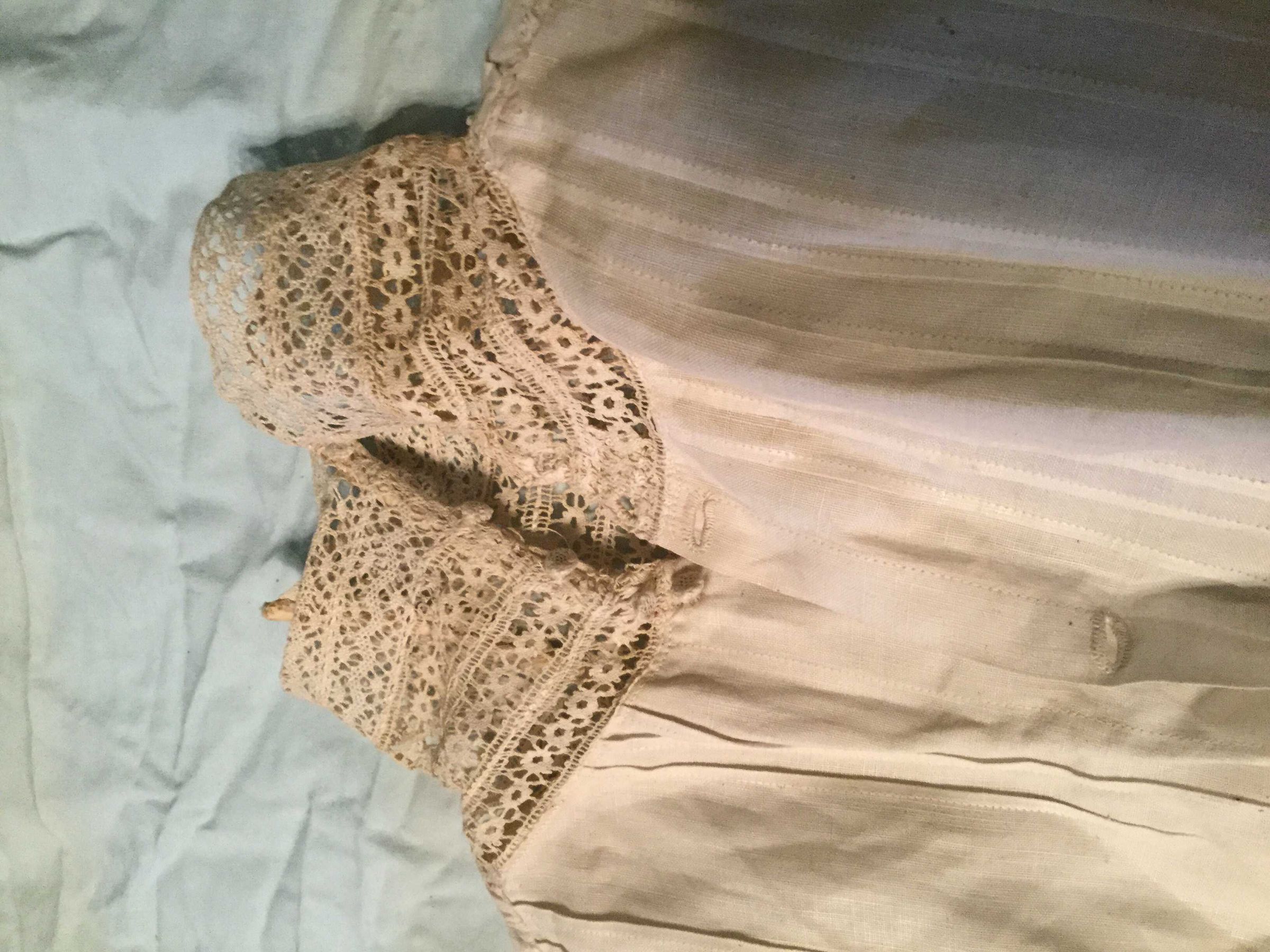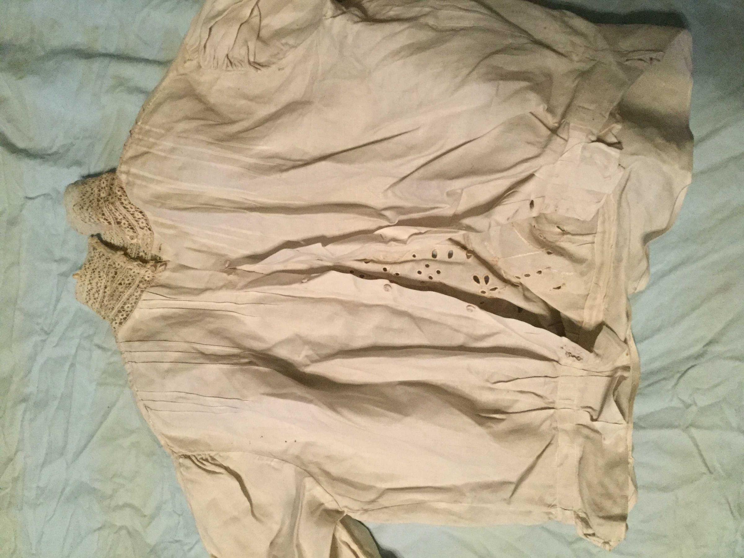 blouse, white over blouse, tucking, embroidered collar, tab, belt, darning 'startched' gathered sleeves, no closures, cuffs pin tucks, pulled. Good condition, longer in front
