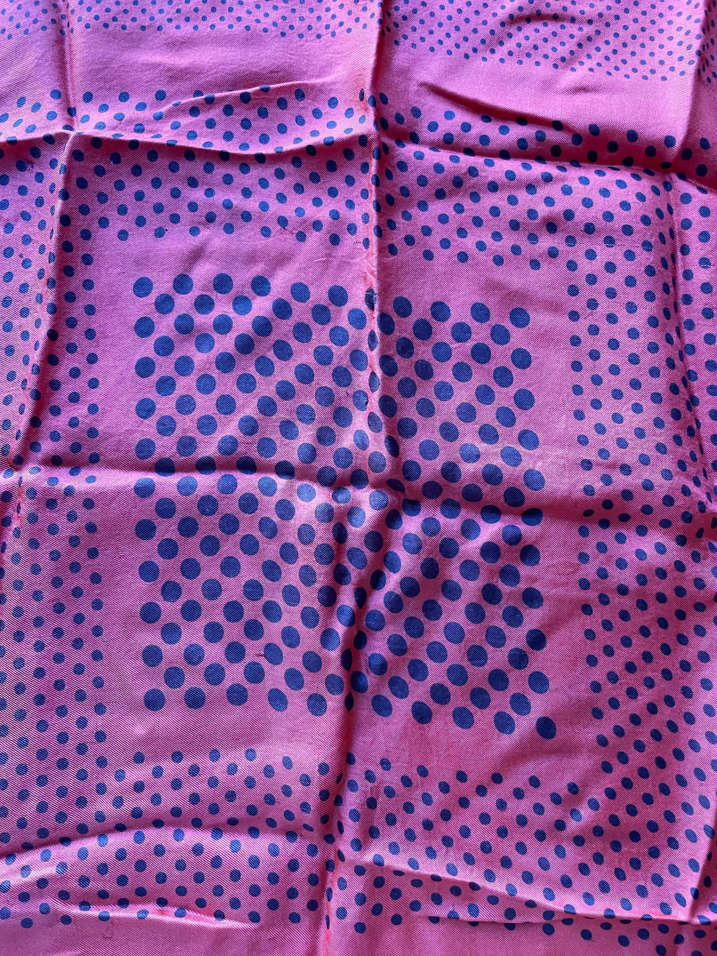 A red and brown polka dot scarf that appears frayed or worn on the edges. The dots are bigger in some areas of the pattern and smaller in others.