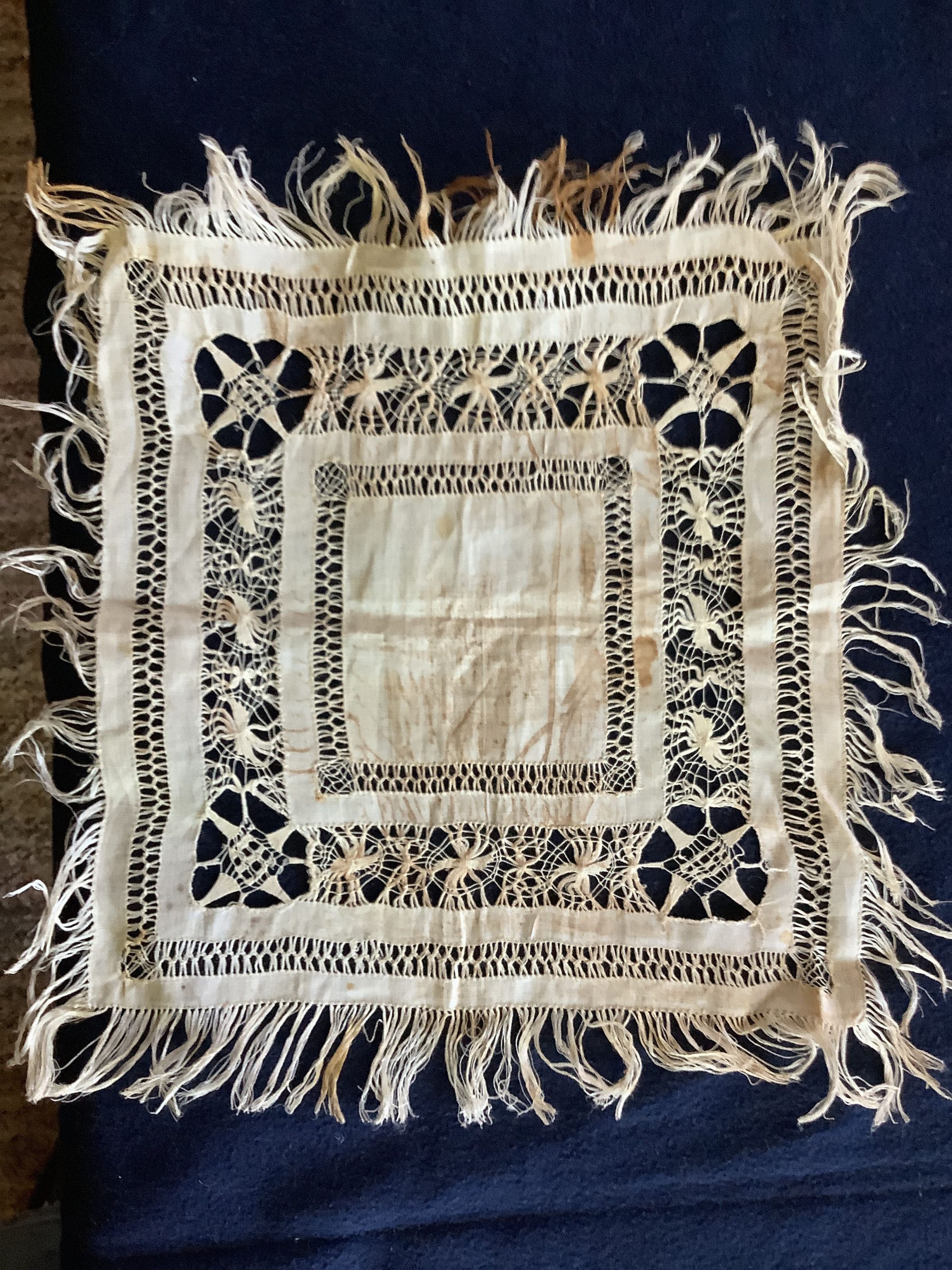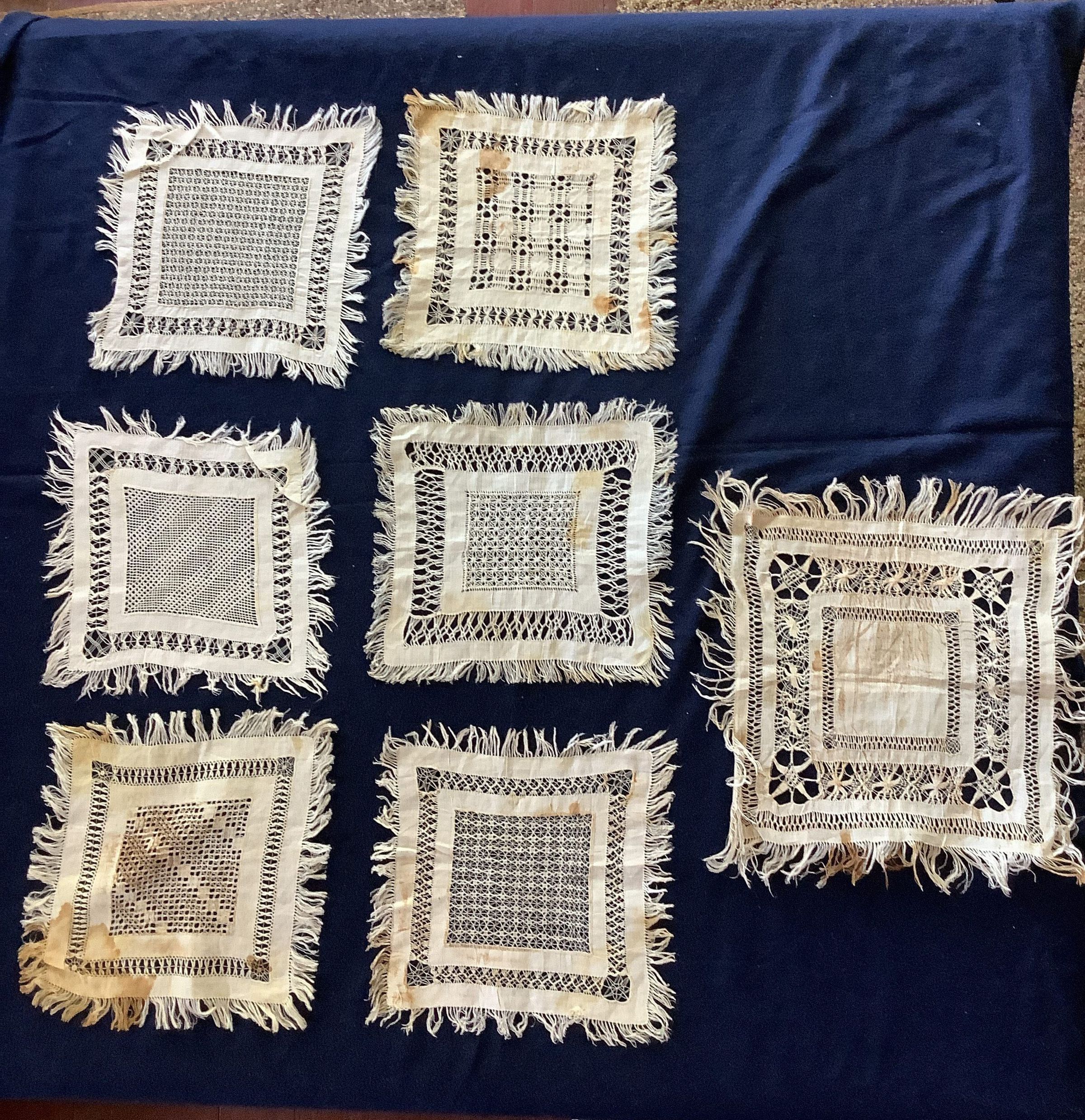 These are 7 square textiles with cotton and woven thread designs, all with tassels around the edges. They all have slightly different designs, one is larger than the rest (see image). There is some creasing and yellowing stains.Create Date