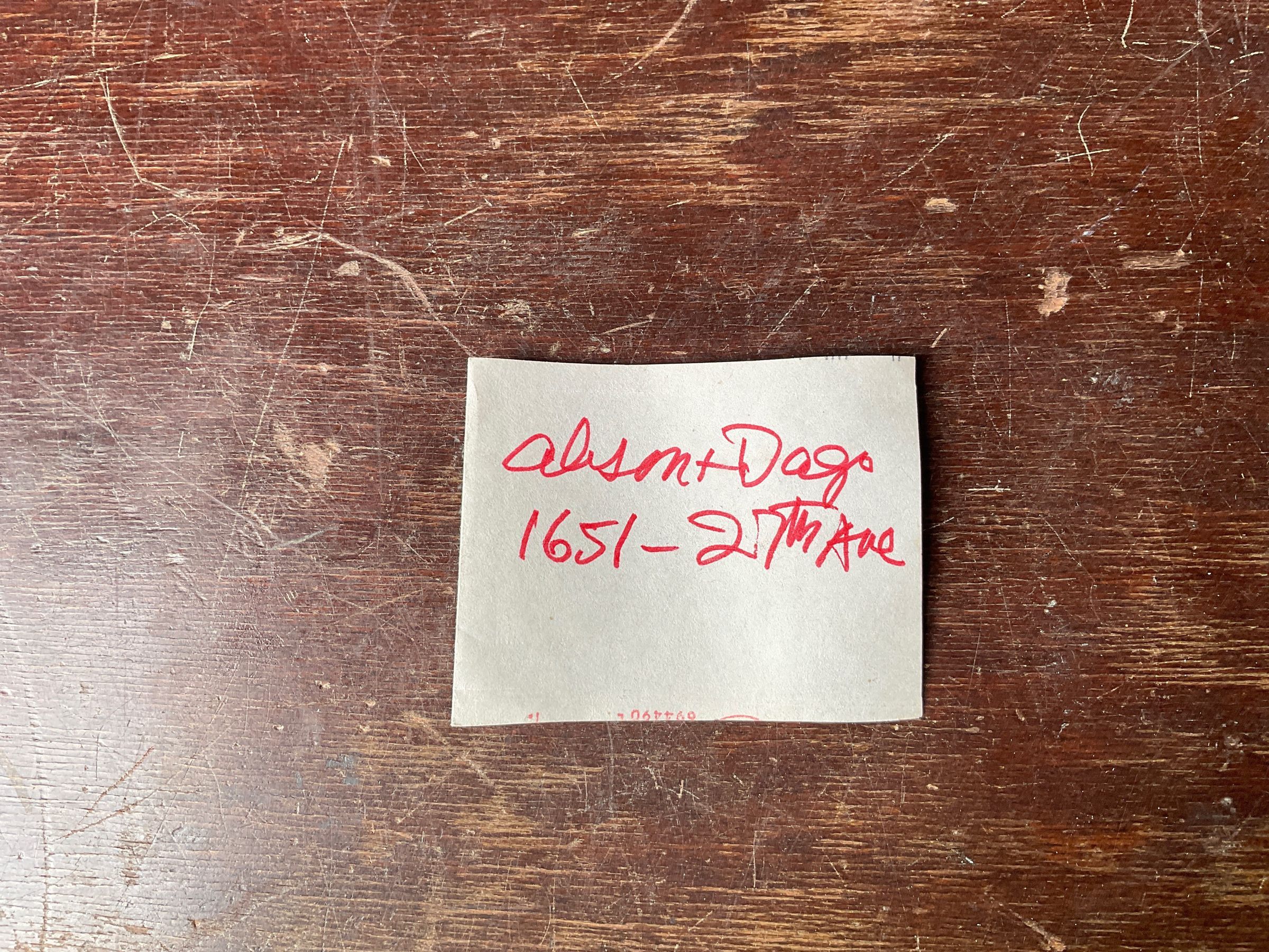 A piece of scrap paper with some notes on it. The note reads: “Alison + Dazo 1651 - 27th Ave”.