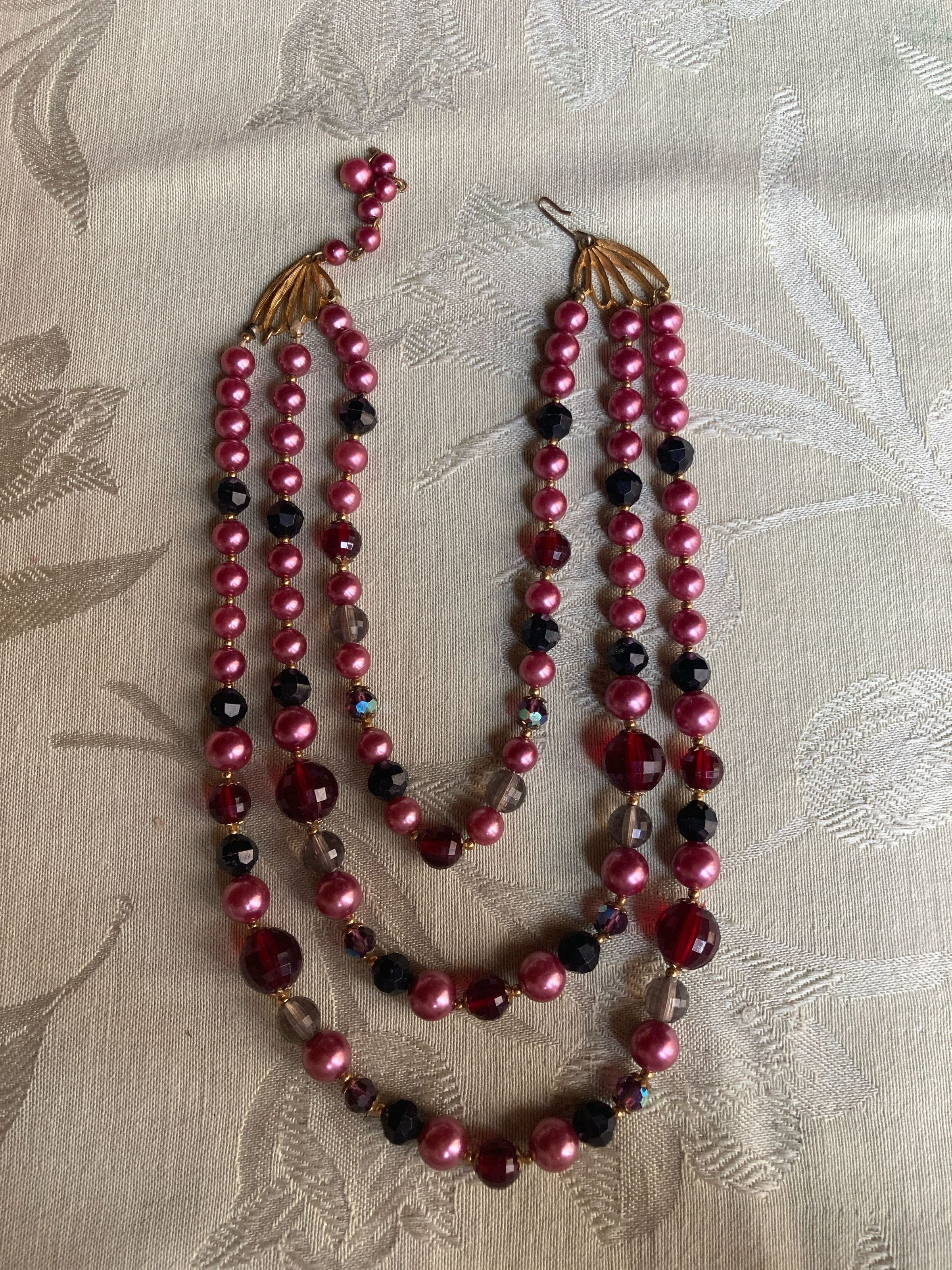Three strand necklace with pink, red, black, gold, and clear plastic beads. The clasp is a gold toned hook and extender chain.Collection