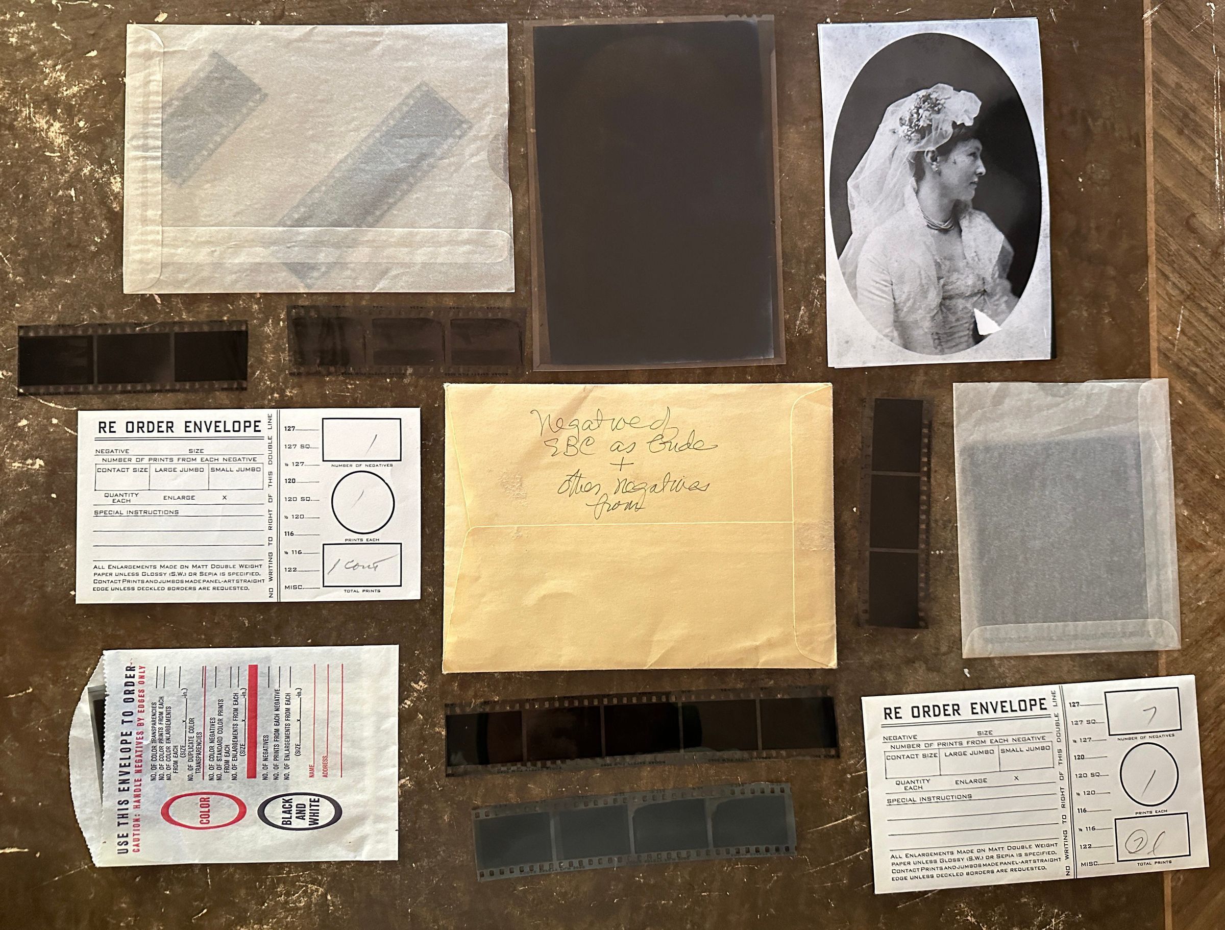The negative depicts a man, positioned at the far right of the picture, smoking a cigarette. He has a hat, no shirt, and swim trunks. He is on a bridge, or landing of some sort, near a lake surrounded by trees and a house at the far back.Collection