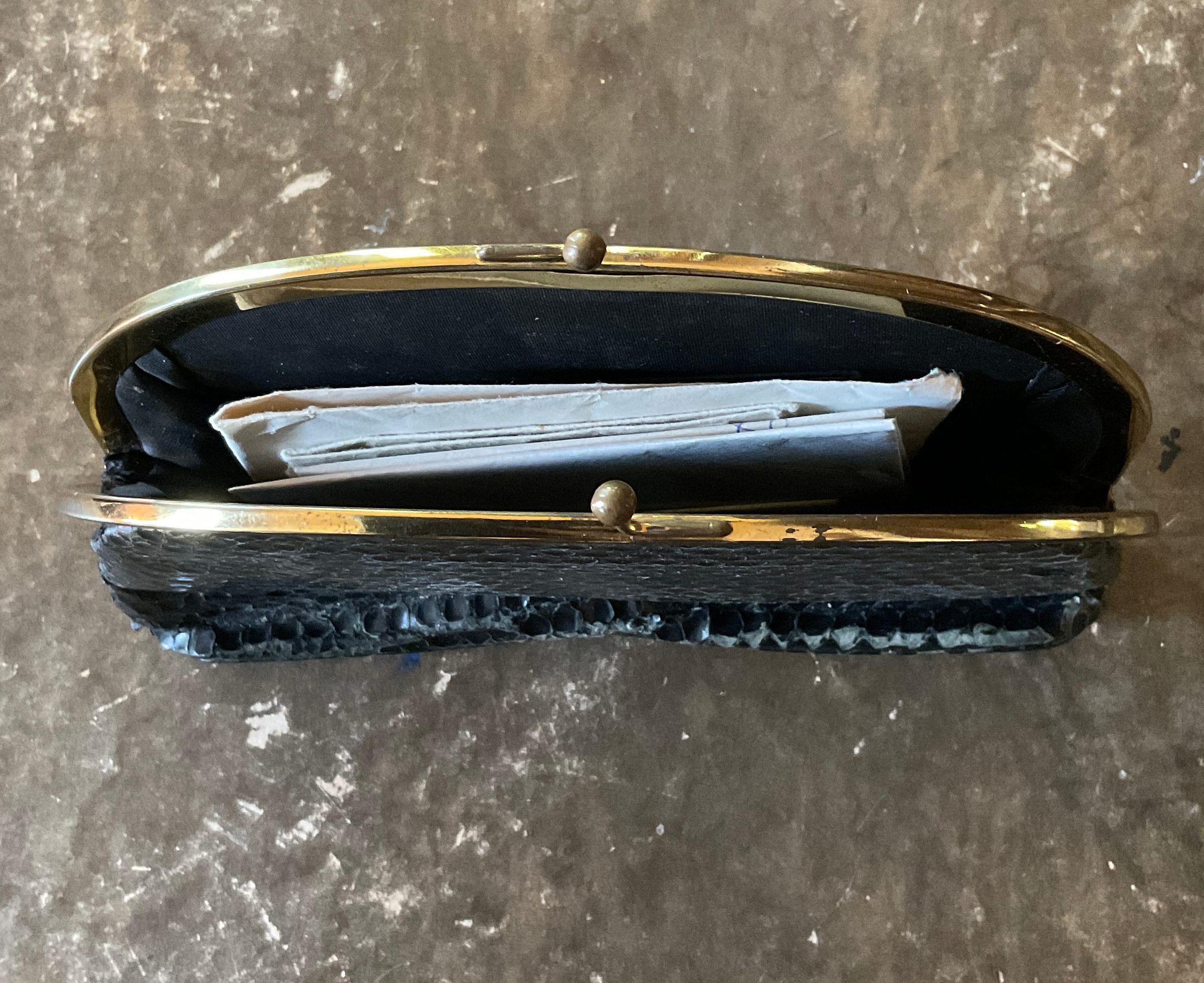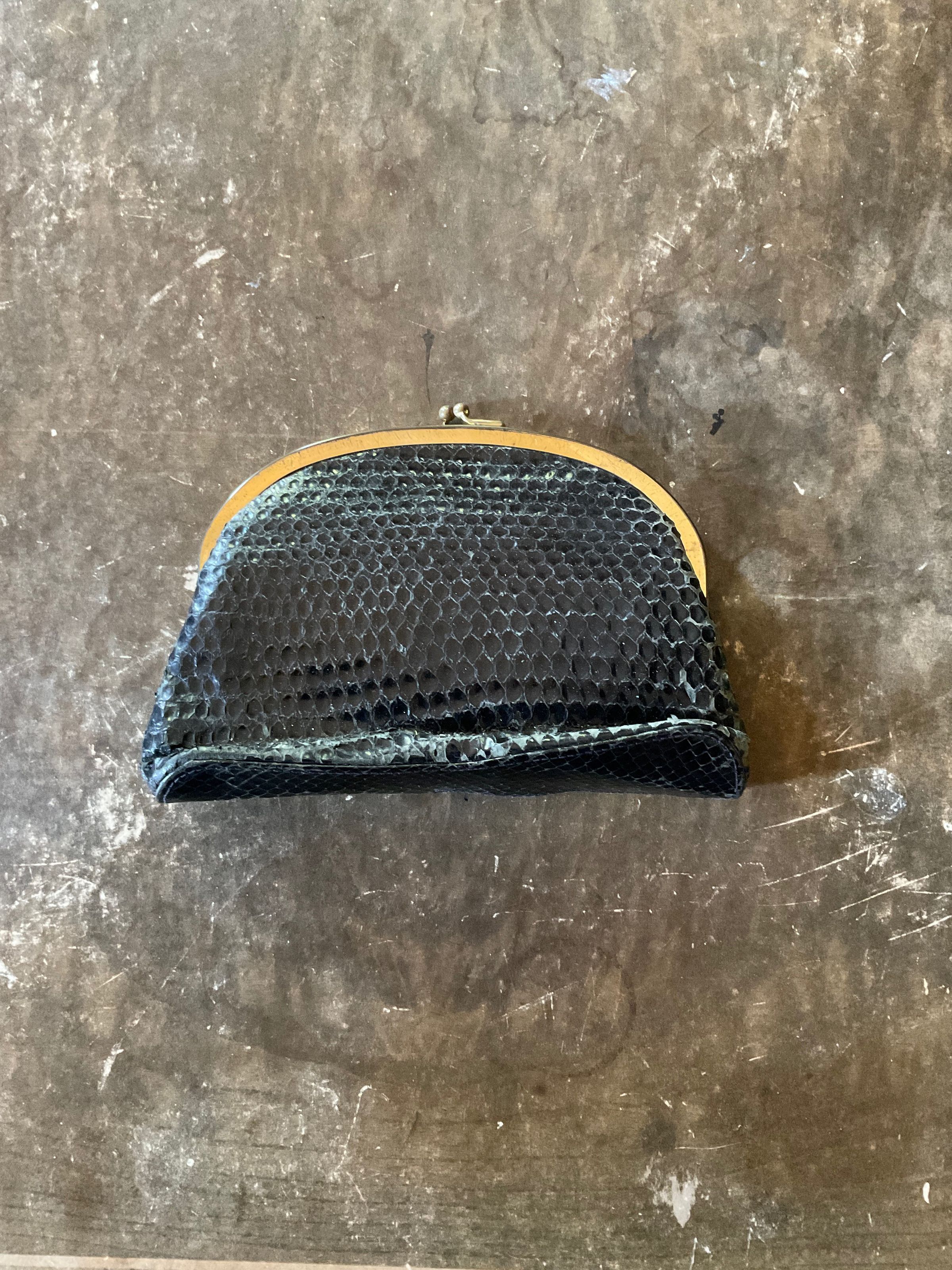 Black snake pattern purse. It has a gold snap closure. Inside the purse there were still various papers, a check book, and a pendant. The purse is from the brand Majestic.Collection